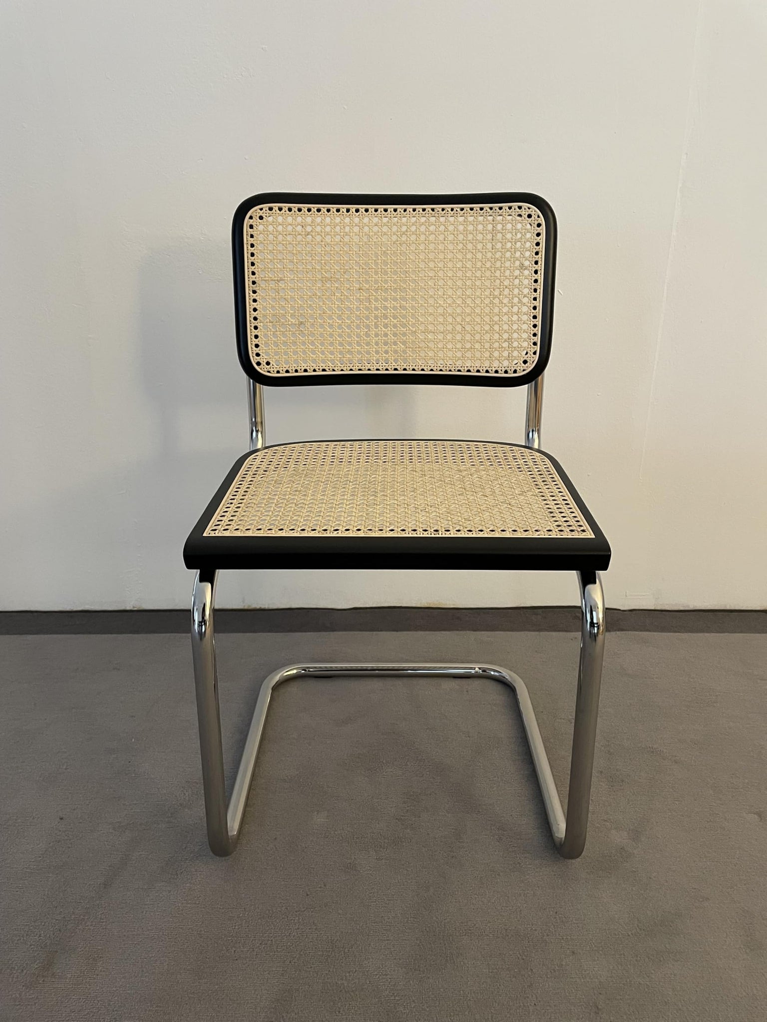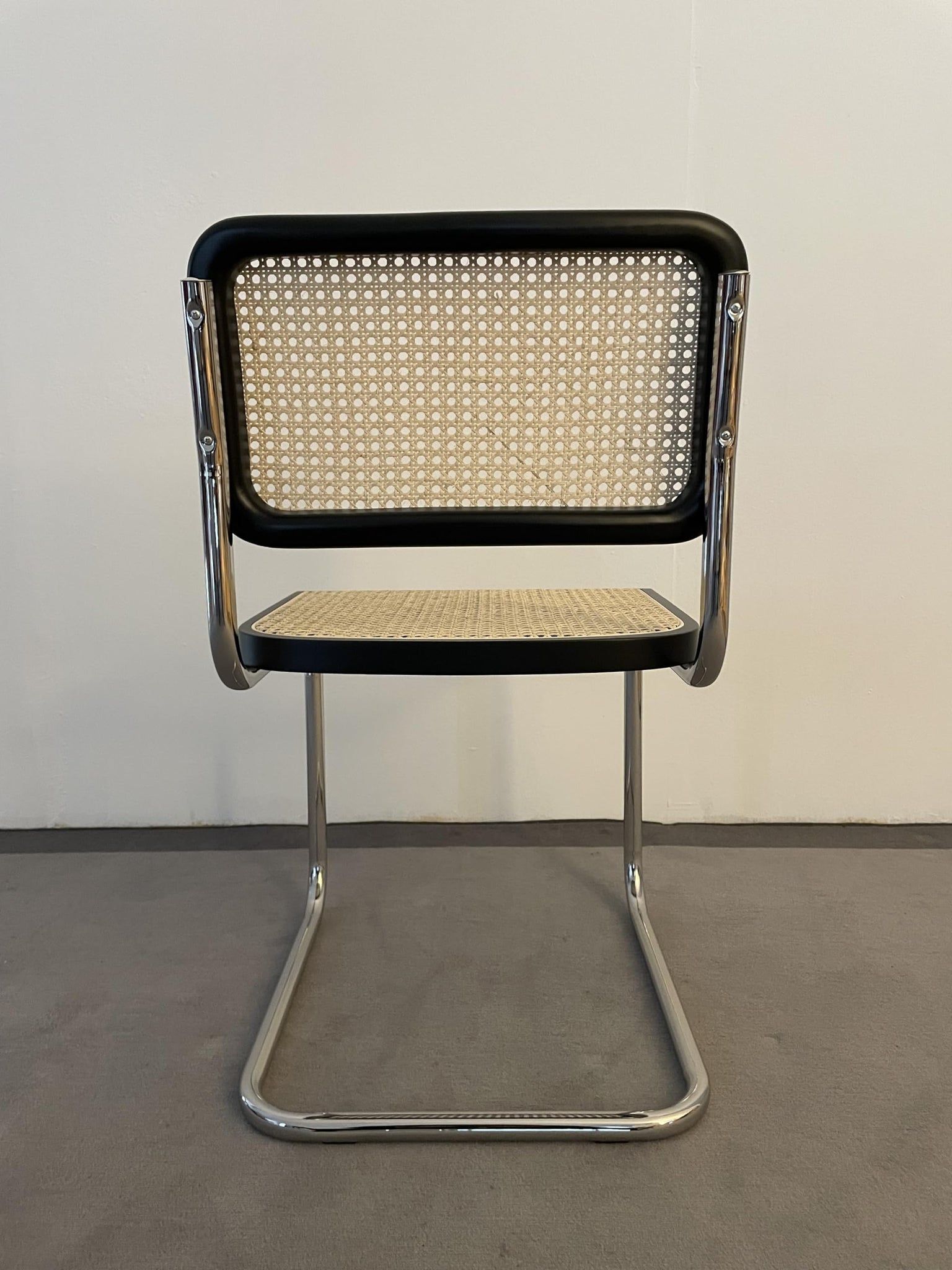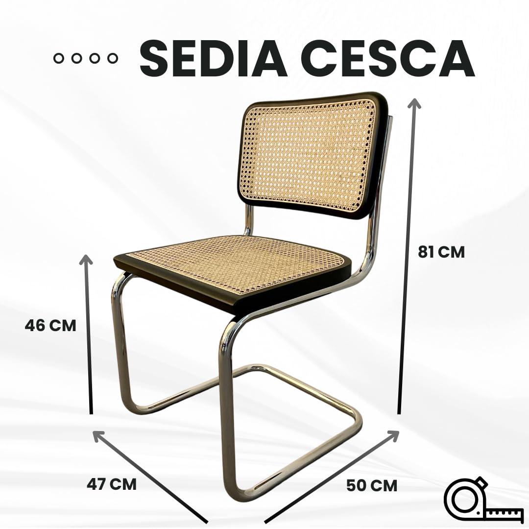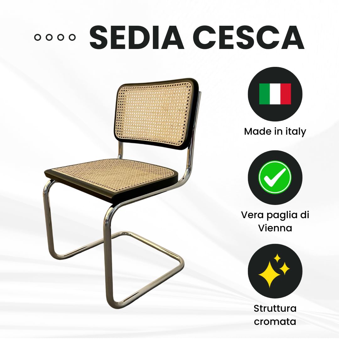 Chaise cesca en véritable paille de Vienne naturelle, bord en bois de hêtre massif laqué noir et structure en acier chromé 47 x 50 x 81 cm (assise h. 46) Fabriqué en Italie