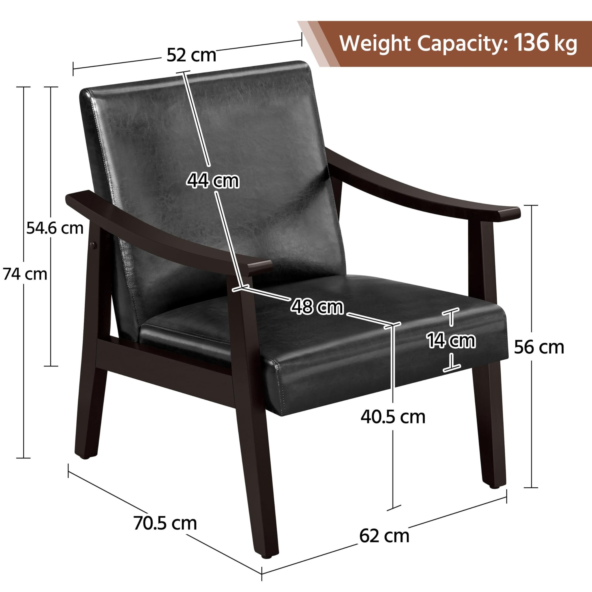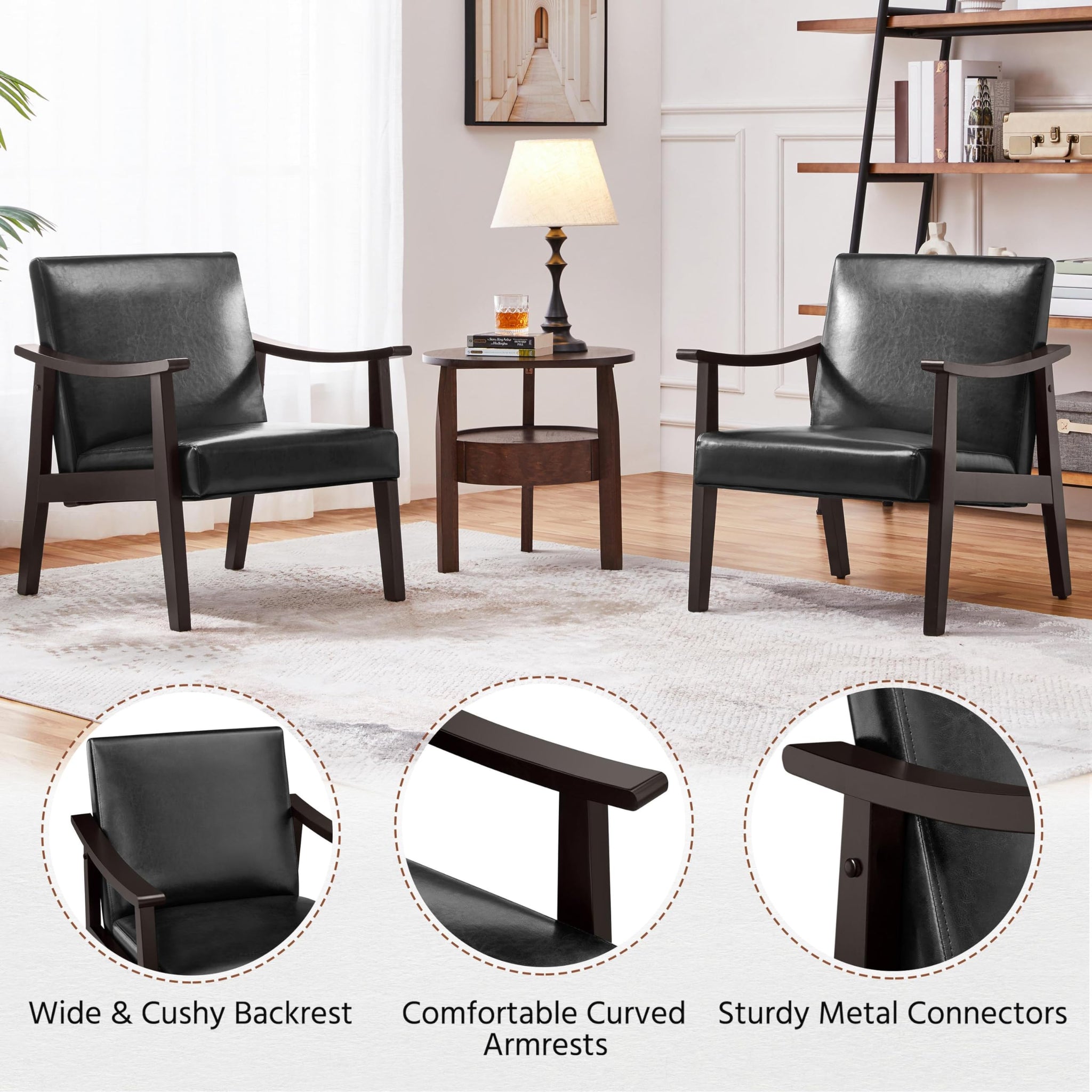 - Rétro et moderne : Un fauteuil de salon moderne du milieu du siècle. Le similicuir et le bois fusionnent en harmonie, ajoutant une touche élégante à votre intérieur. Une chaise de classe facile à assortir.