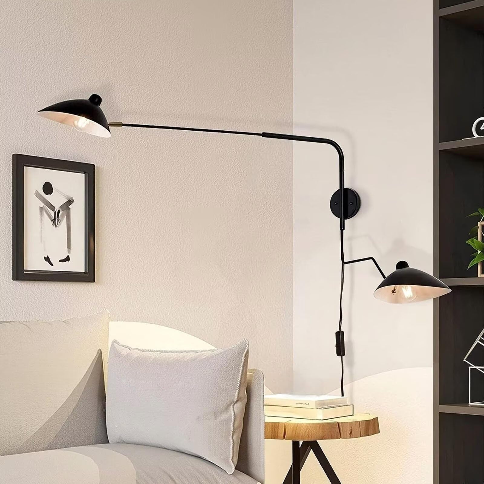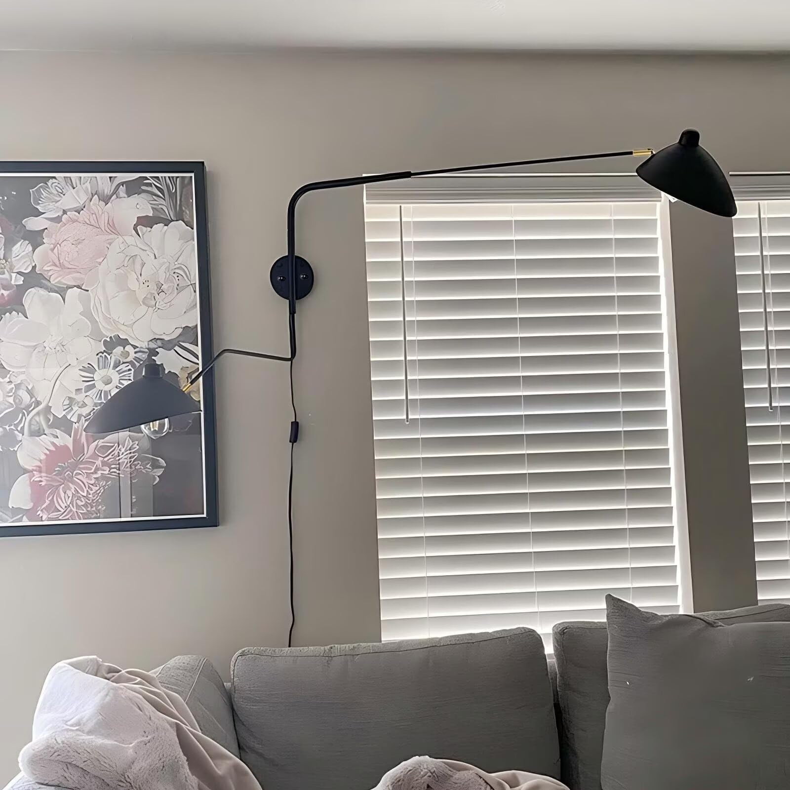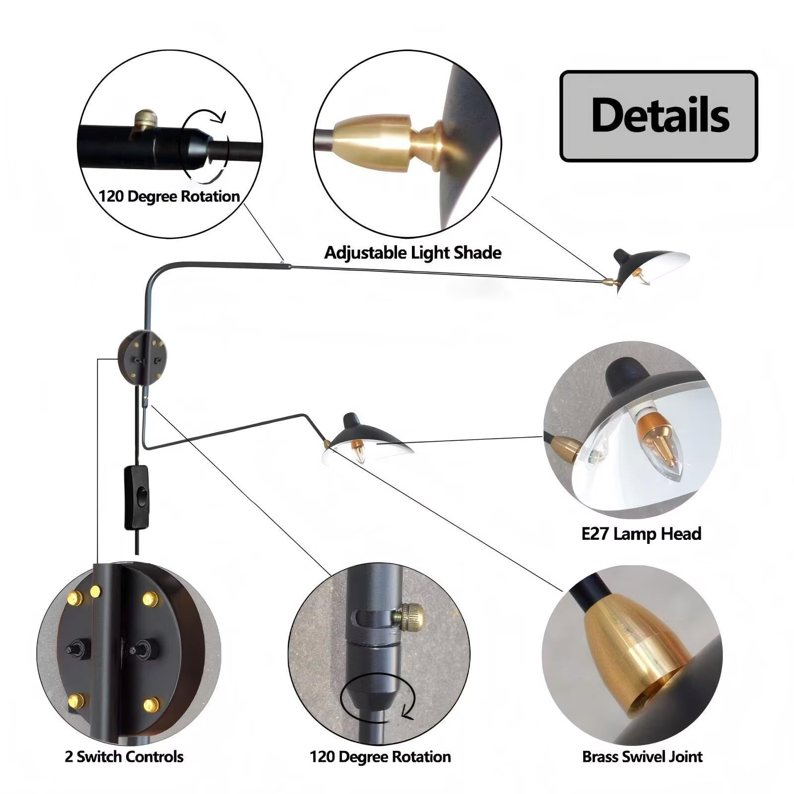 Détails: Cette applique murale à bras pivotant allie esthétique industrielle vintage et praticité quotidienne. Disponible en 4 longueurs (65/95/120/150cm) et deux finitions (noir mat/blanc épuré), elle s'adapte à toutes les configurations spatiales grâce à son bras métallique réglable sur 180° et son abat-jour orientable à 360°.