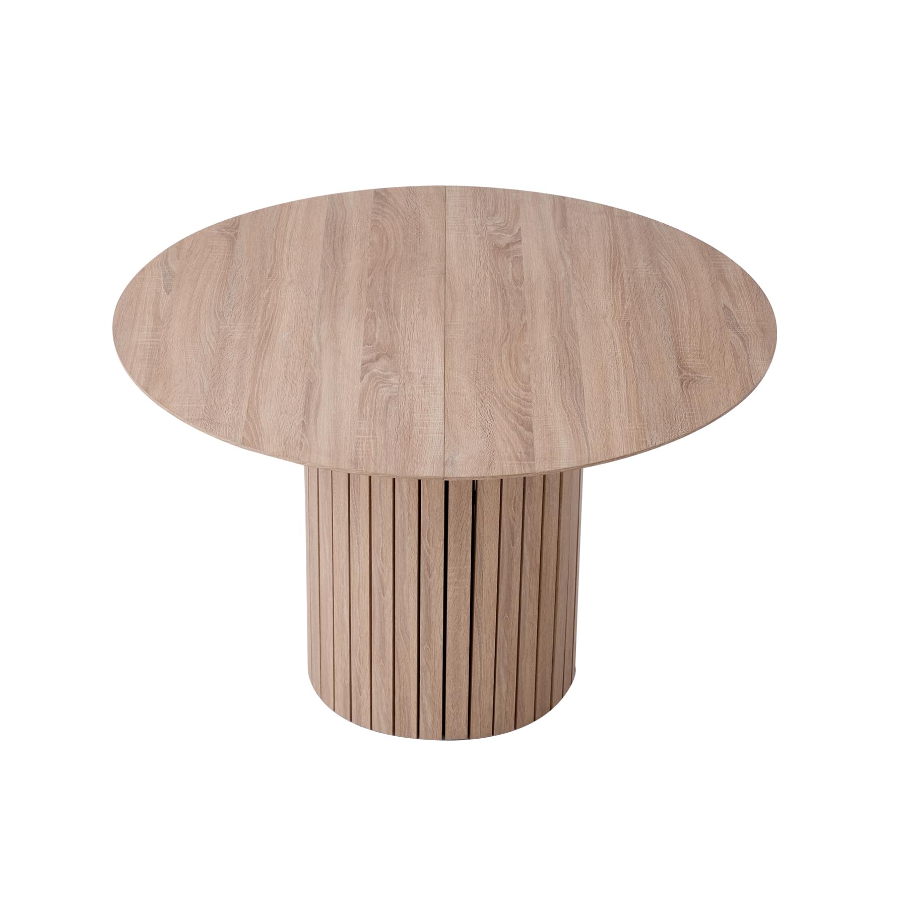 BenyLed Table de Salle à Manger Ronde de 120 cm pour 4-6 Personnes, Table de Cuisine Fermière avec Base Cylindrique, Plateau en MDF et Socle à Lattes en Bois (Grain de Bois Clair)
