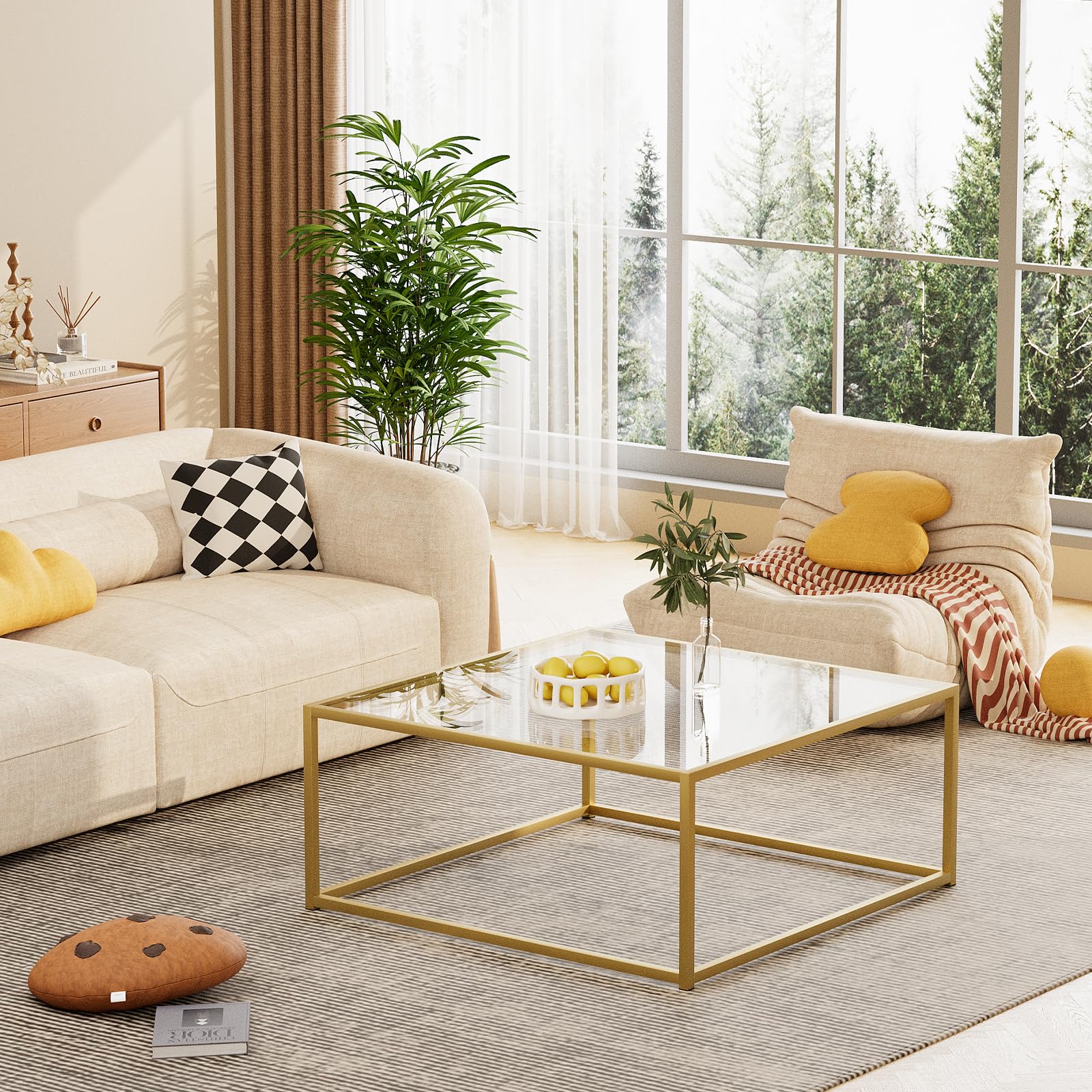 Petite table basse carrée en verre pour salon, table centrale simple et moderne pour petits espaces, table basse dorée pour salon, assemblage facile, 66 x 66 cm (doré et verre transparent)