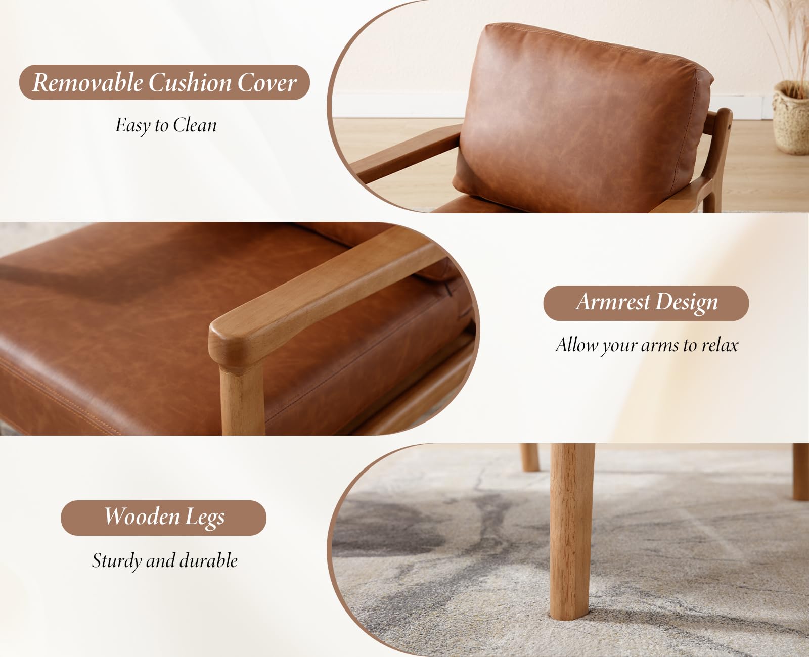 - 【Fauteuil Vintage】Ce fauteuil du milieu du siècle est doté d'une structure en bois et d'un revêtement unique en Cuir PU marron pour une touche d'élégance, ce qui le rend idéal pour un décor à la fois vintage et moderne.
