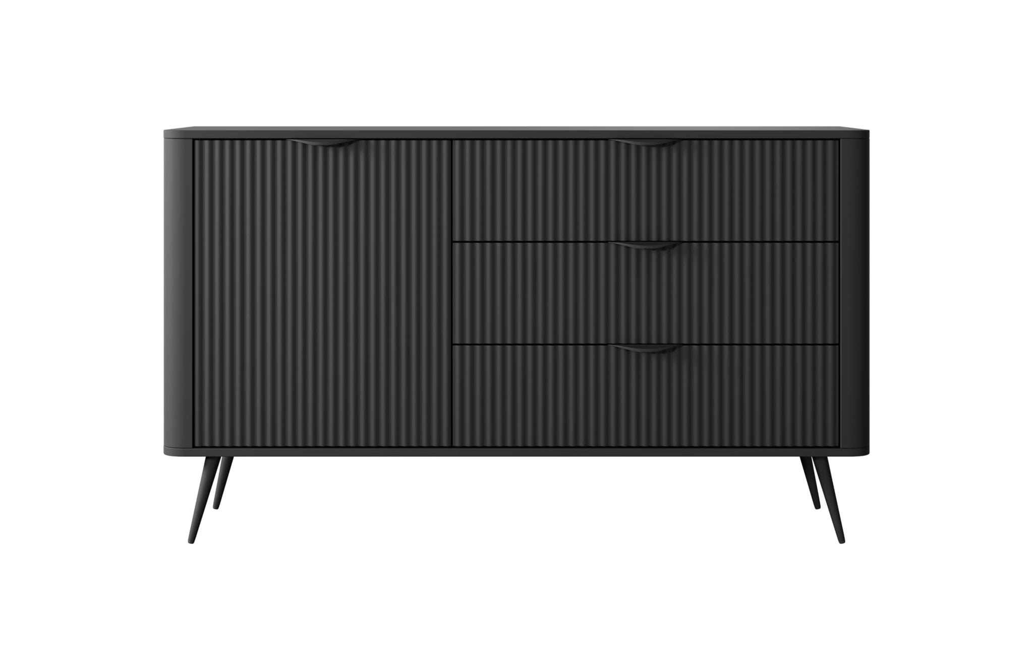• Commode : trois tiroirs, une porte, Couleur du meuble : noir, meuble réalisé dans un style moderne, s'intègre parfaitement dans le salon et les autres pièces