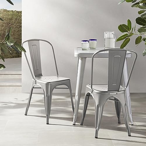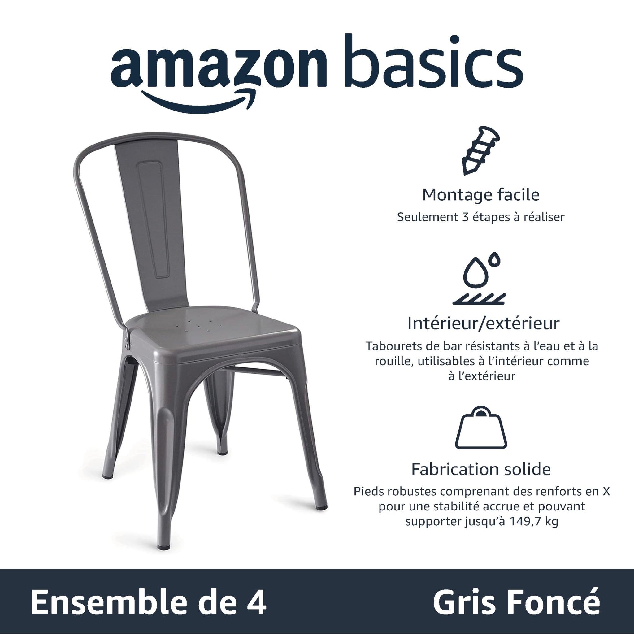 Amazon Basics Lot de 4 chaises de salle à manger empilables en métal avec dossier pour bistrot, cuisine, intérieur et extérieur, Gris Foncé, 51 x 43 x 85 cm