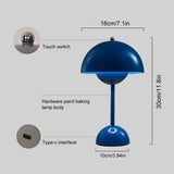 - Taille : 18 x 18 x 30 cm. Capacité de la batterie : 1800 mAh. Temps d'utilisation : 10 à 12 heures (en fonction de la luminosité). Matériau de la coque : métal (fer). Couleurs : noir, blanc, rouge, gris, bleu, jaune. Poids : 870 g. Contenu : 1 lampe de bureau en forme de champignon.