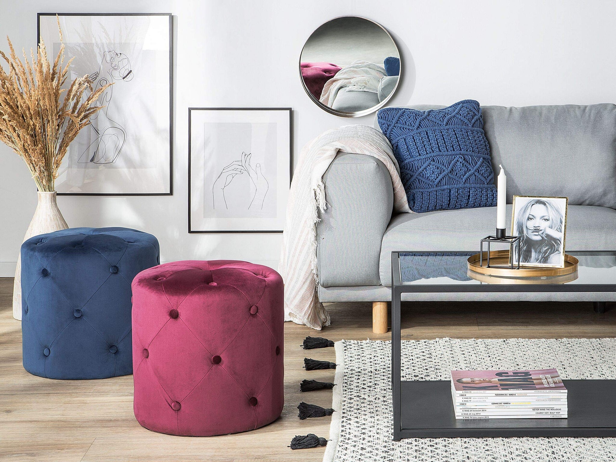 Beliani Pouf de Forme Cylindrique Type Chesterfield fabriqué en Velours Synthétique Bleu Foncé pour Salon ou Chambre Moderne