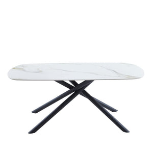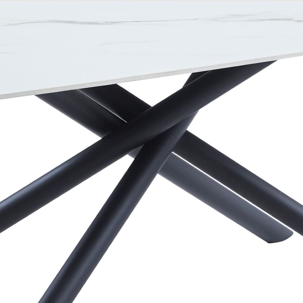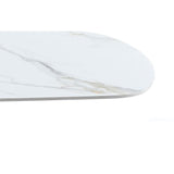 - Le plateau de table mesure 12 mm d'épaisseur et est en pierre frittée avec un beau motif en marbre blanc avec des veines dorées