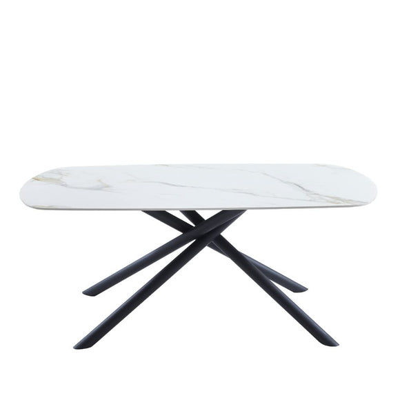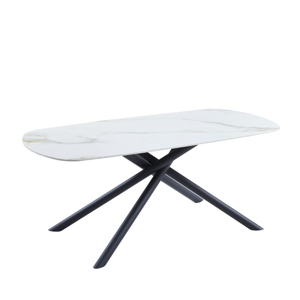 Casa Vital Table à manger AZGON, blanc et or, 180 x 90 x 76 cm, pierre frittée, motif marbre blanc avec veines dorées, pieds en métal noir avec forme intéressante