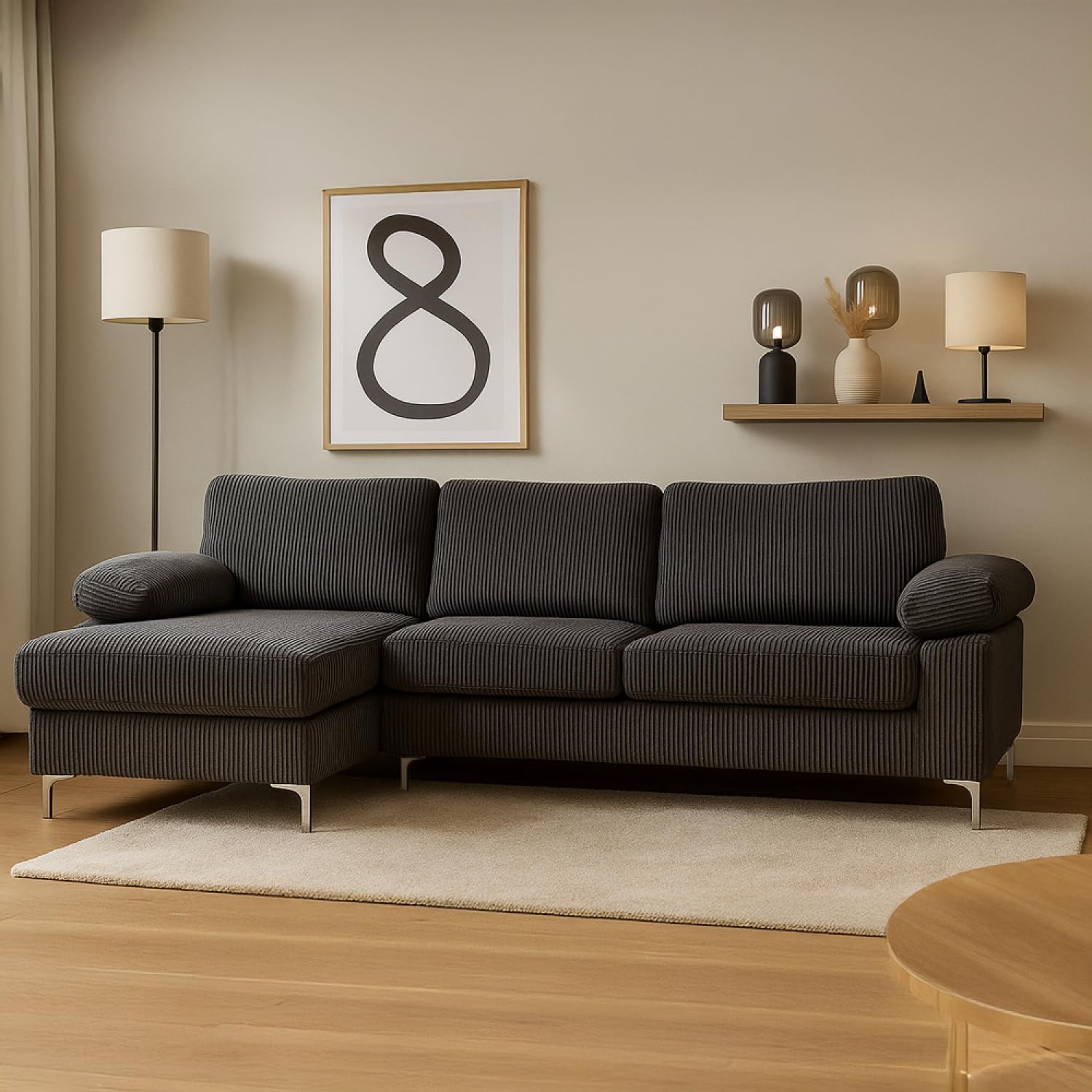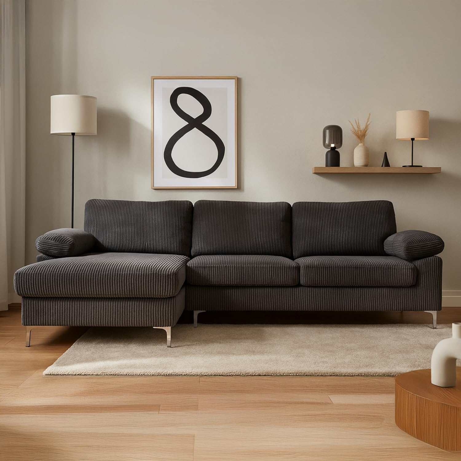 CONCEPT USINE | Canapé d’Angle 4-5 Places Galway Gris Anthracite | Méridienne Gauche | Velours Côtelé Ultra Doux | Assise Profonde et Moelleuse | Pieds Métal | Confort Durable | Look Contemporain