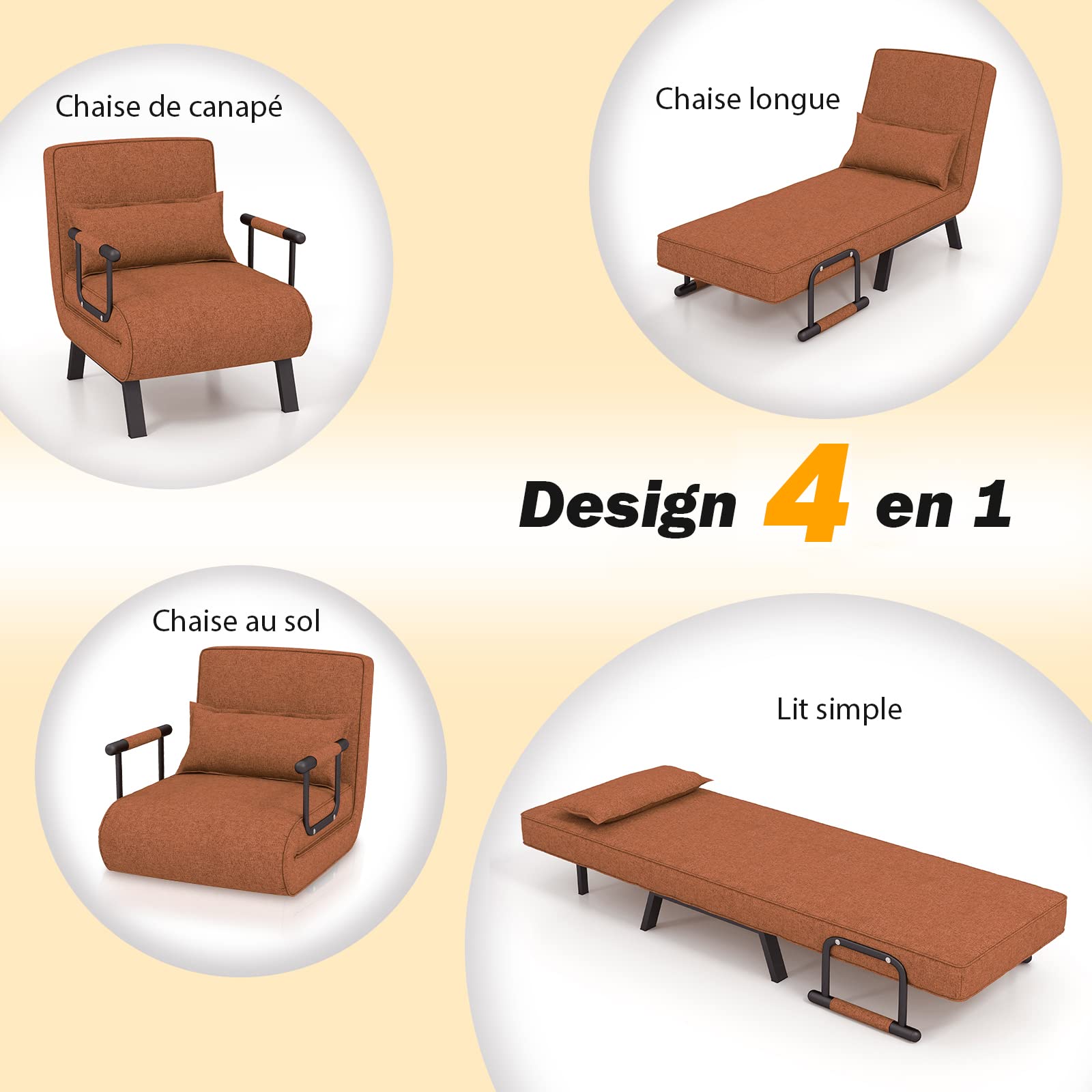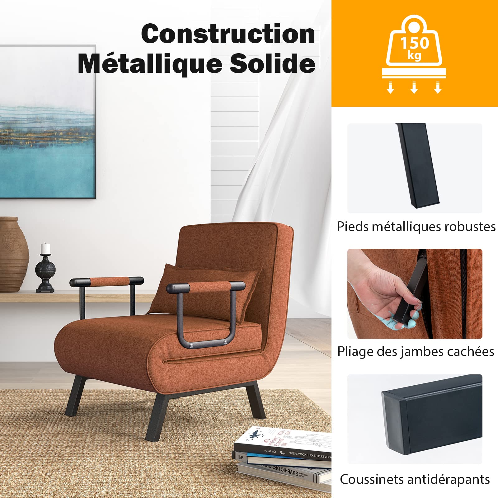 COSTWAY Fauteuil Convertible 1 Place, Fauteuil-Lit Chauffeuse 4-en-1 Dossier Réglable 6 Position, Oreiller, Siège Rembourré, Accoudoirs, Cadre Métal, Canapé-Lit Pliant pour Maison, Bureau (café)