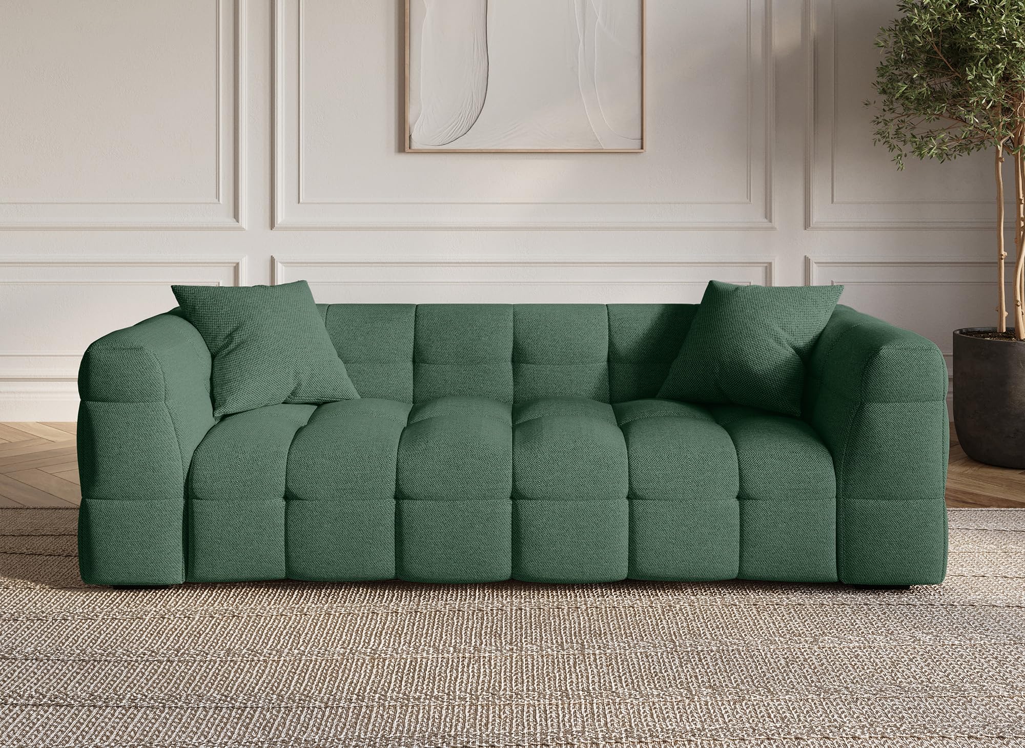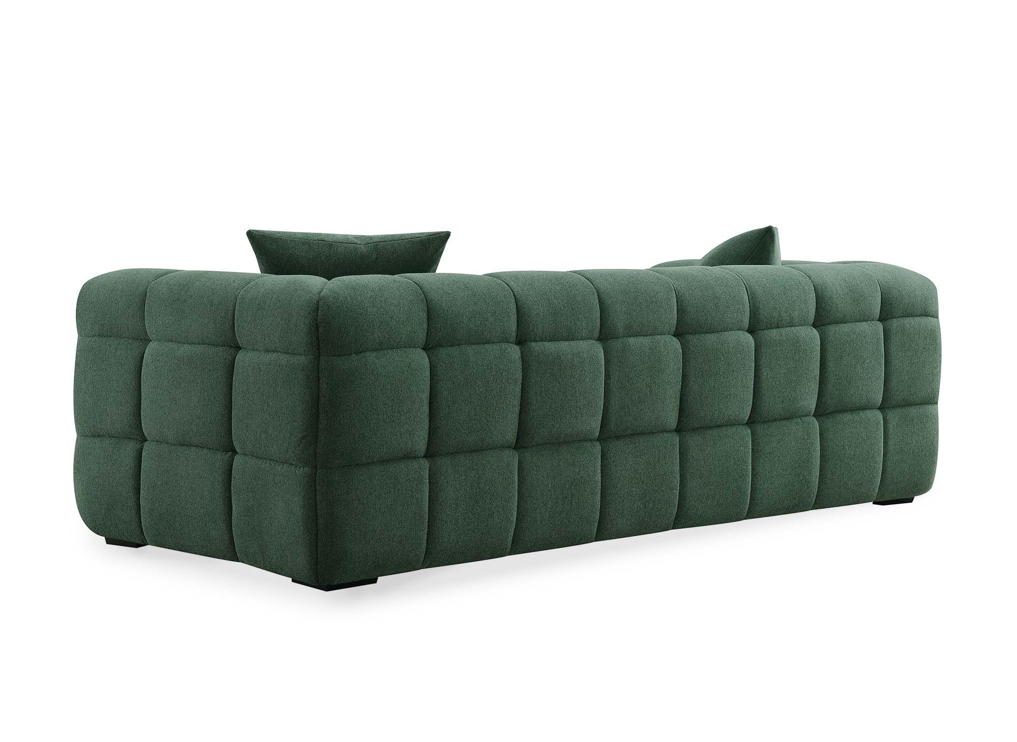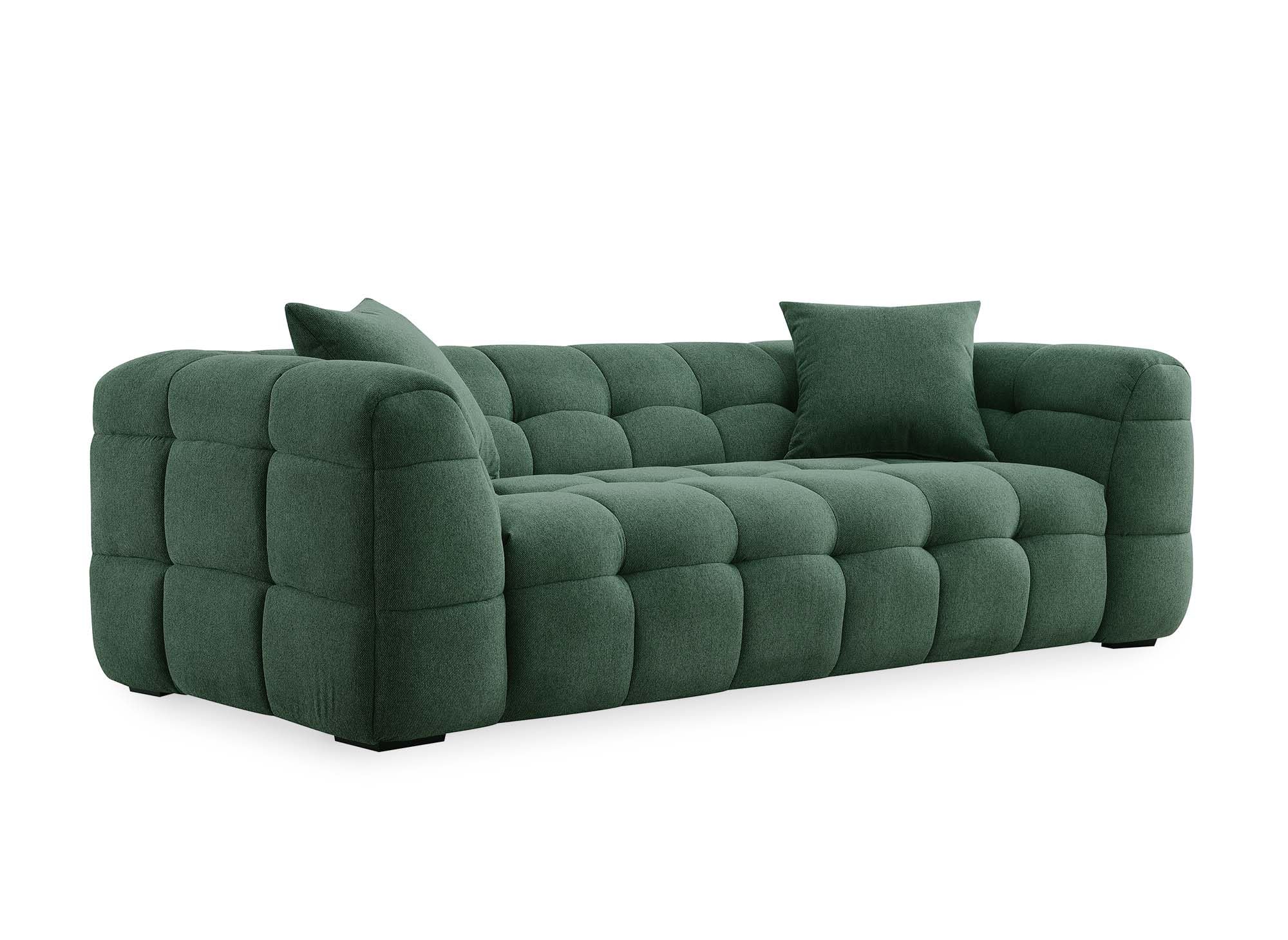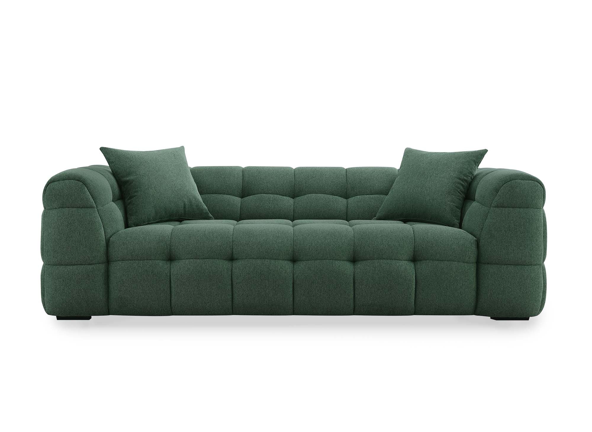 Détails: Découvrez notre canapé design 3 places en tissu vert, alliant confort et élégance pour un salon de luxe. Parfait pour une décoration intérieure moderne et épurée.. Structure en bois et métal. Piètement en bois noir + 2 coussin inclus.