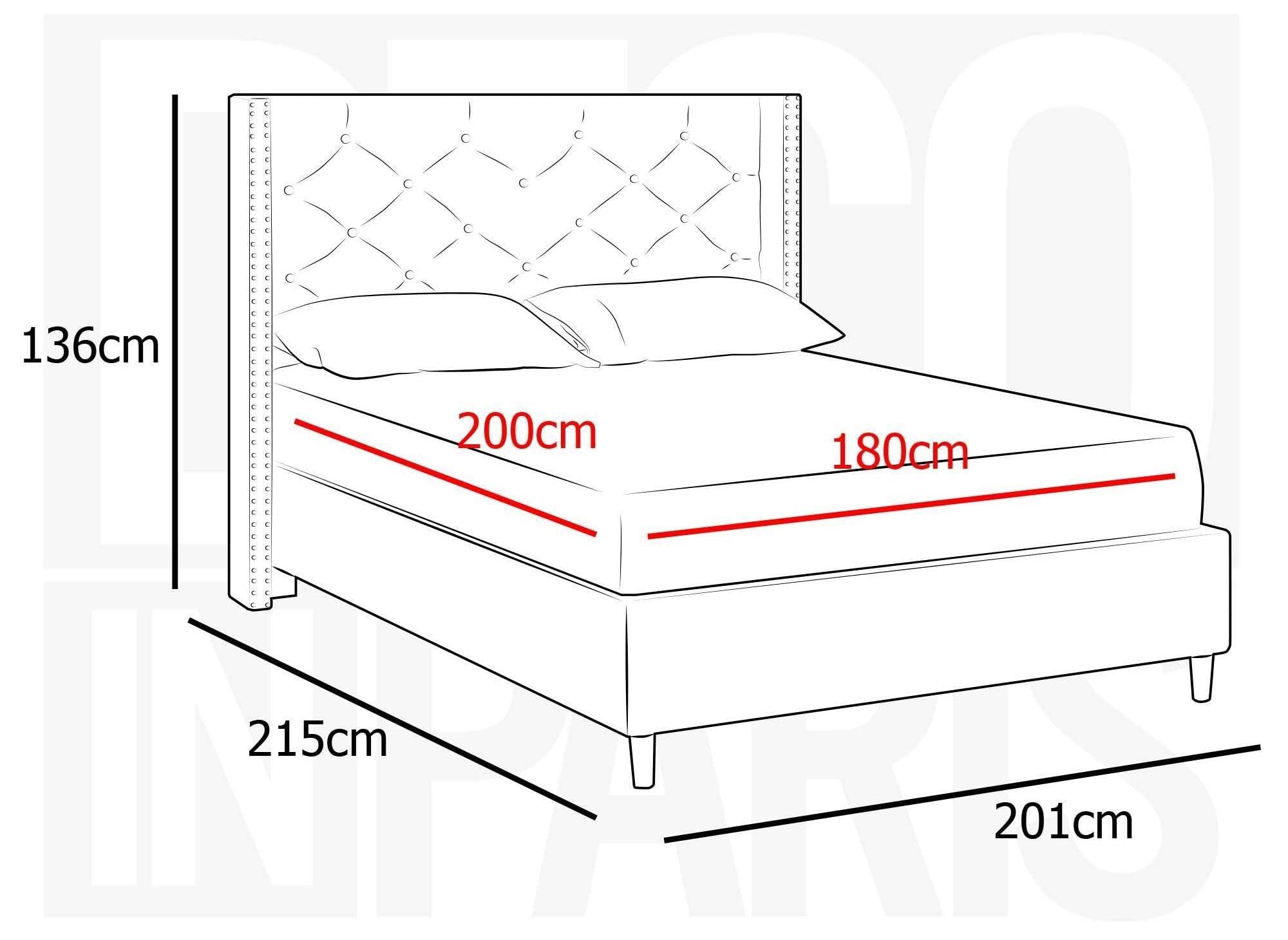 Réinvitez votre univers de la chambre à coucher avec notre lit double MARGOT à tendance baroque revisité. Vous serez séduits par l’aspect moderne et sophistiqué de ce lit en tissu 100% polyester et par l'élégance des finitions, inspirées d'une méthode classique de capitonnage sur la tête de lit. Le retour décoré de petits clous vous procurera une sensation intimiste et cocooning. Le lit double MARGOT s’intègre aussi bien dans des intérieurs très modernes que classiques. Les couleurs pastel et le doux du tissu apporteront une ambiance apaisante à votre pièce. Sommier à lattes en bois arqué vous assure un confort optimal pour de bonnes nuits de sommeil. Existe en plusieurs coloris. Matelas non fourni. Dimensions couchage : 180 x 200 cm Dimensions lit : 200 x 215 cm