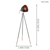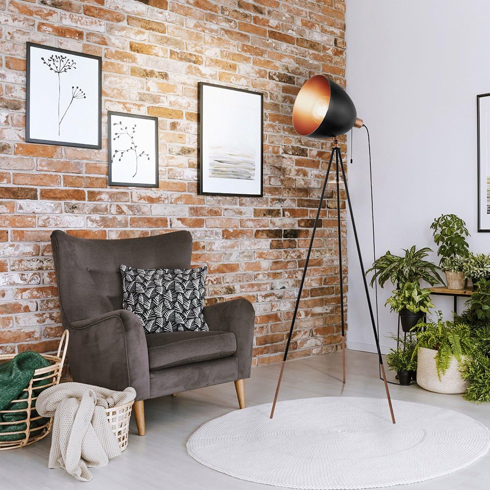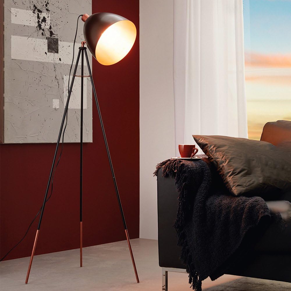 Eglo Lampadaire tripode Chester, lampadaire vintage 1 flamme, lampadaire en acier, couleur : noir, cuivre, douille : E27, interrupteur à tirette inclus