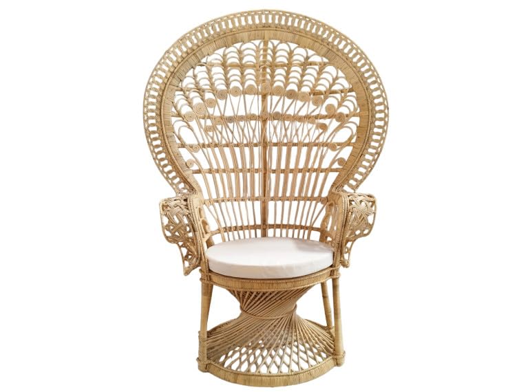 Détails: Découvrez le fauteuil Emmanuelle en rotin tressé avec un coussin blanc PEACOCK.