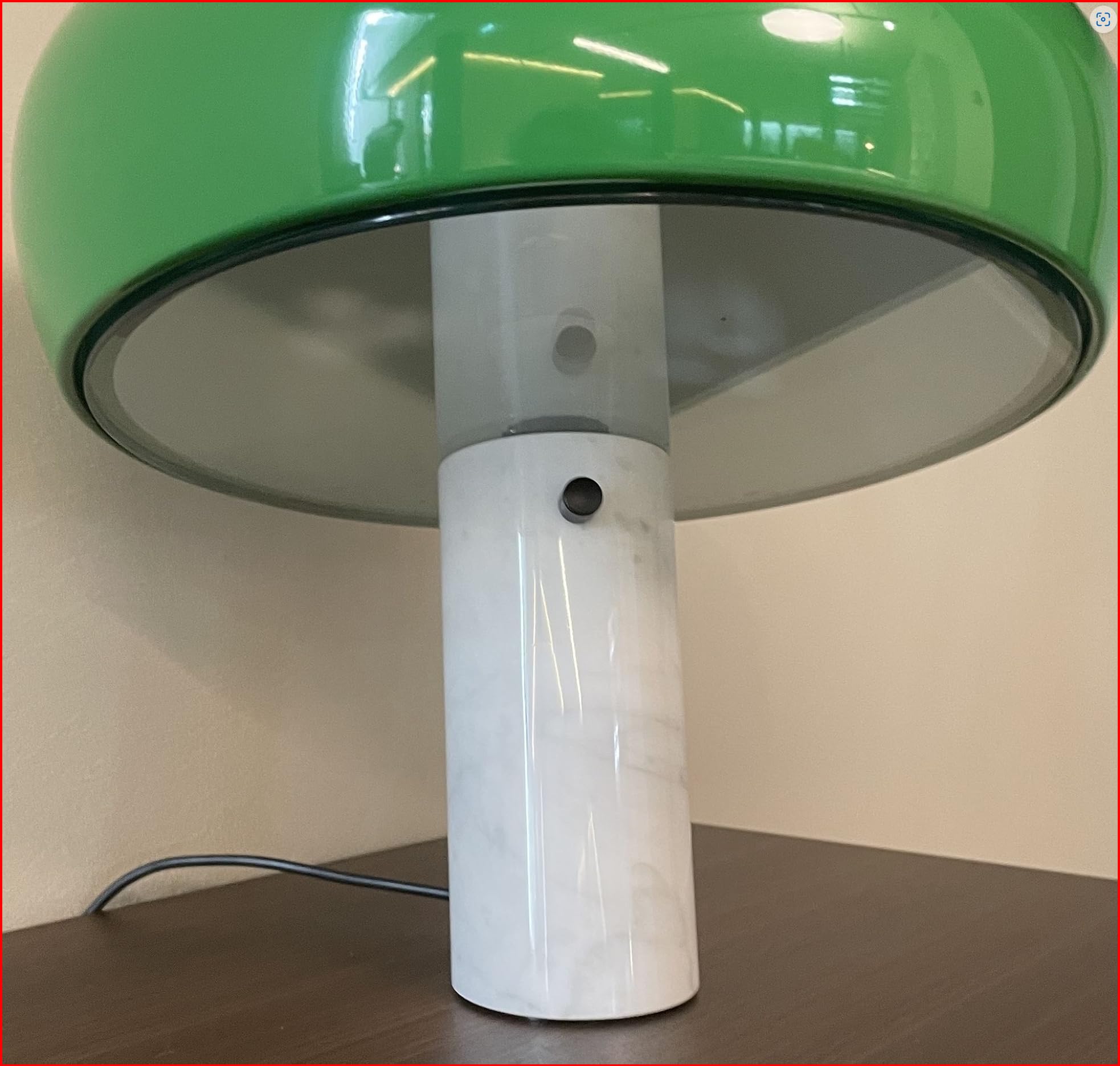 Détails: Snoopy est une lampe de table conçue par Achille Castiglioni & Pier Giacomo Castiglioni pour Flos en 1967, au ton élégant et sympathique, qui révèle le célèbre personnage de Snoopy né de l'idée du célèbre auteur de bandes dessinées Charles M. Schulz. La lampe Snoopy est équipée d'une élégante base en marbre blanc ; elle émet une lumière directe avec un réflecteur métallique en plaque, vernie vert. Snoopy illumine les pièces de votre maison de manière ironique et exclusive. La pureté et l'éclat des matériaux en font un objet original, capable de transformer et de mettre en valeur votre environnement avec sa présence. Les fonctions marche/arrêt sont grâce au variateur tactile intégré avec lequel il est possible de régler l'intensité avec capteur situé sur la base en marbre. Caractéristiques du produit : hauteur 36,5 cm / largeur 39,4 cm. Informations techniques : ampoule compatible 1 x max 105 W HSGS ou LED 8 W E27 (non incluse).