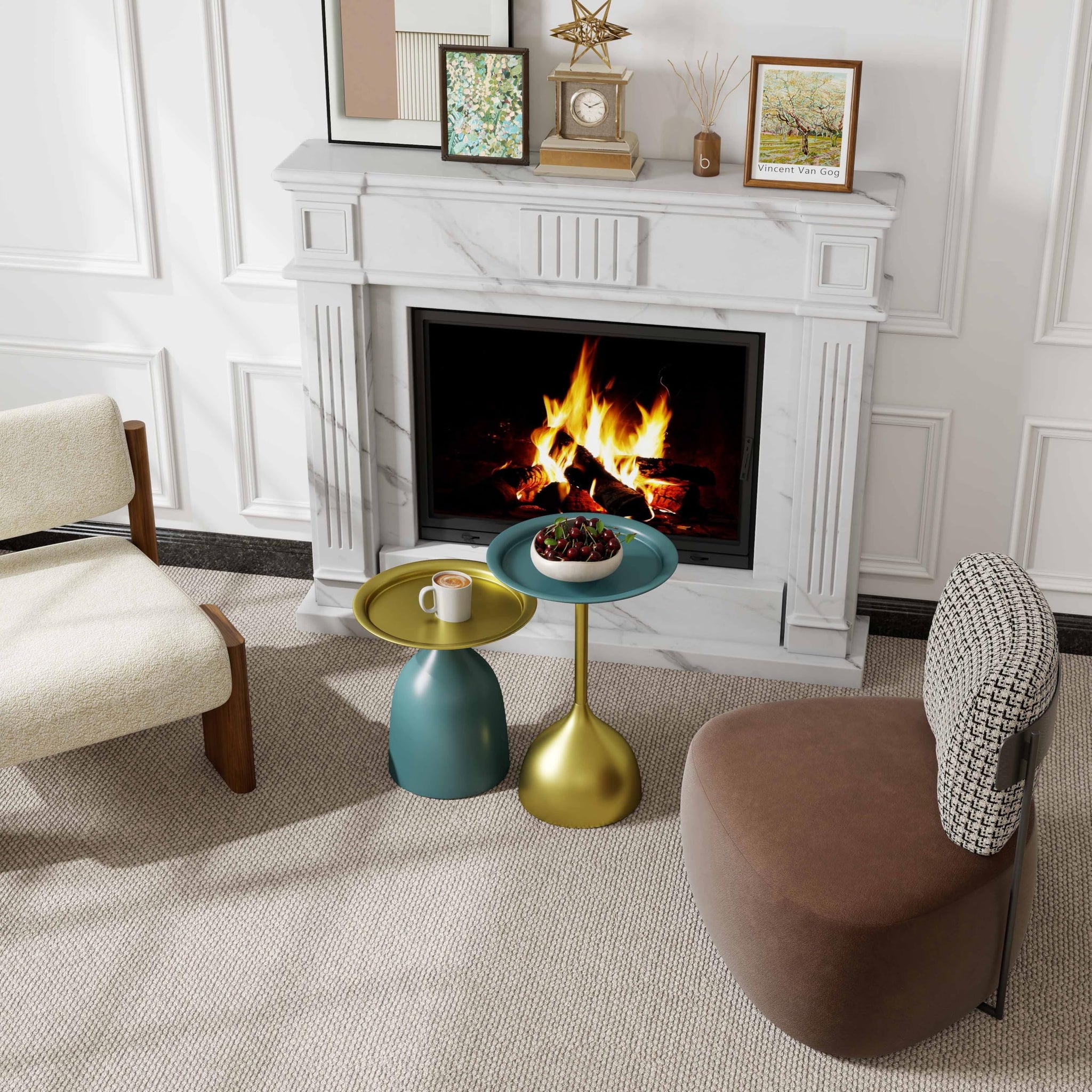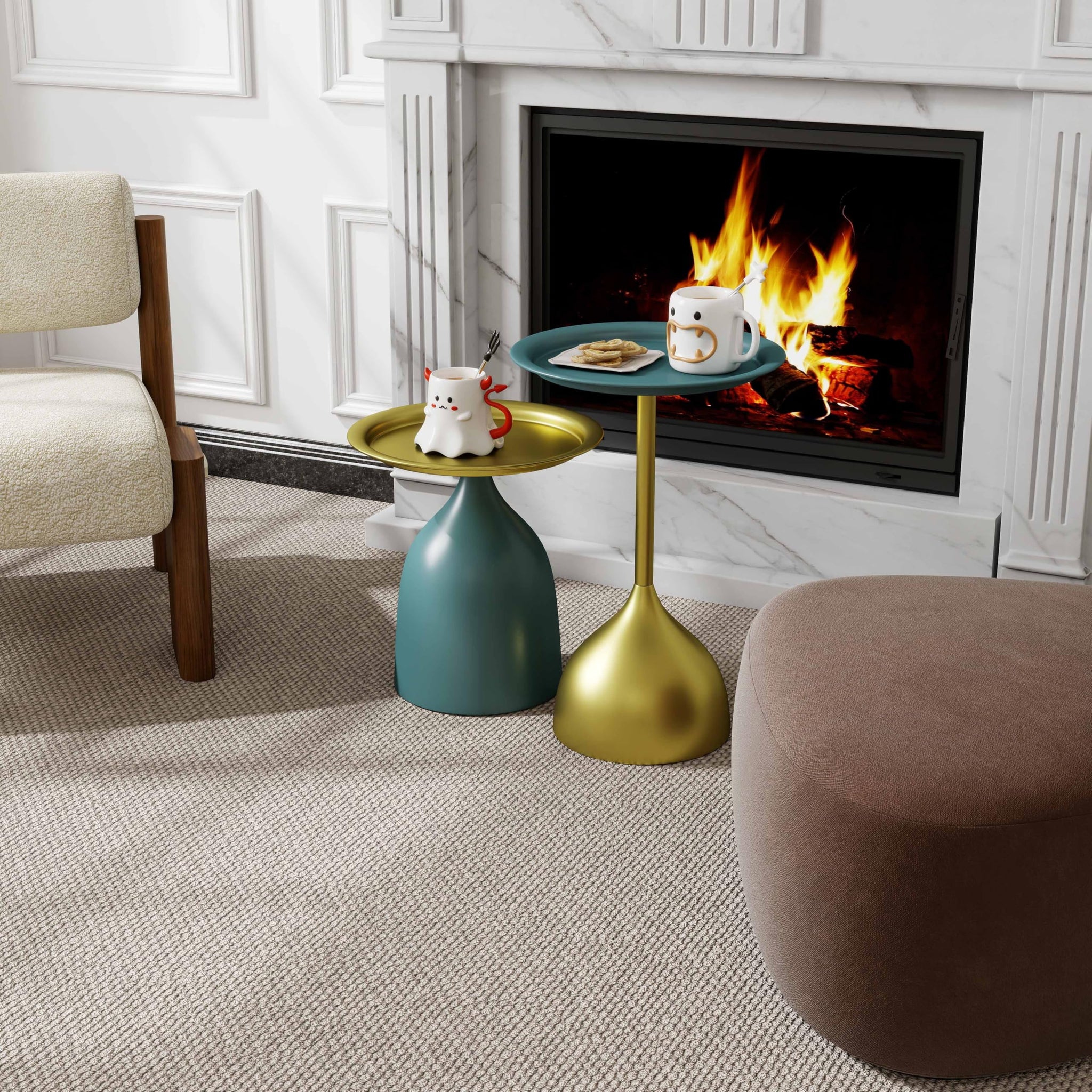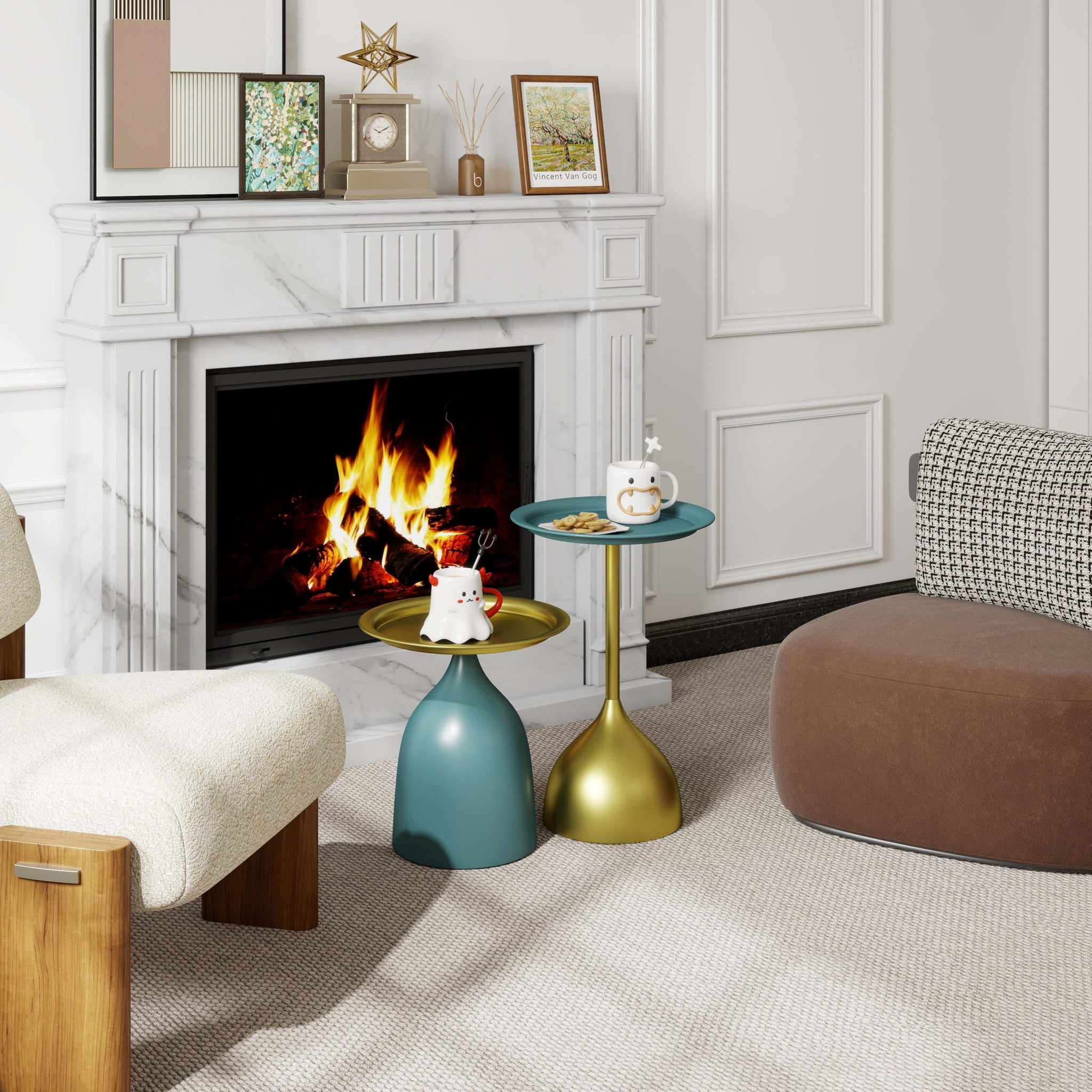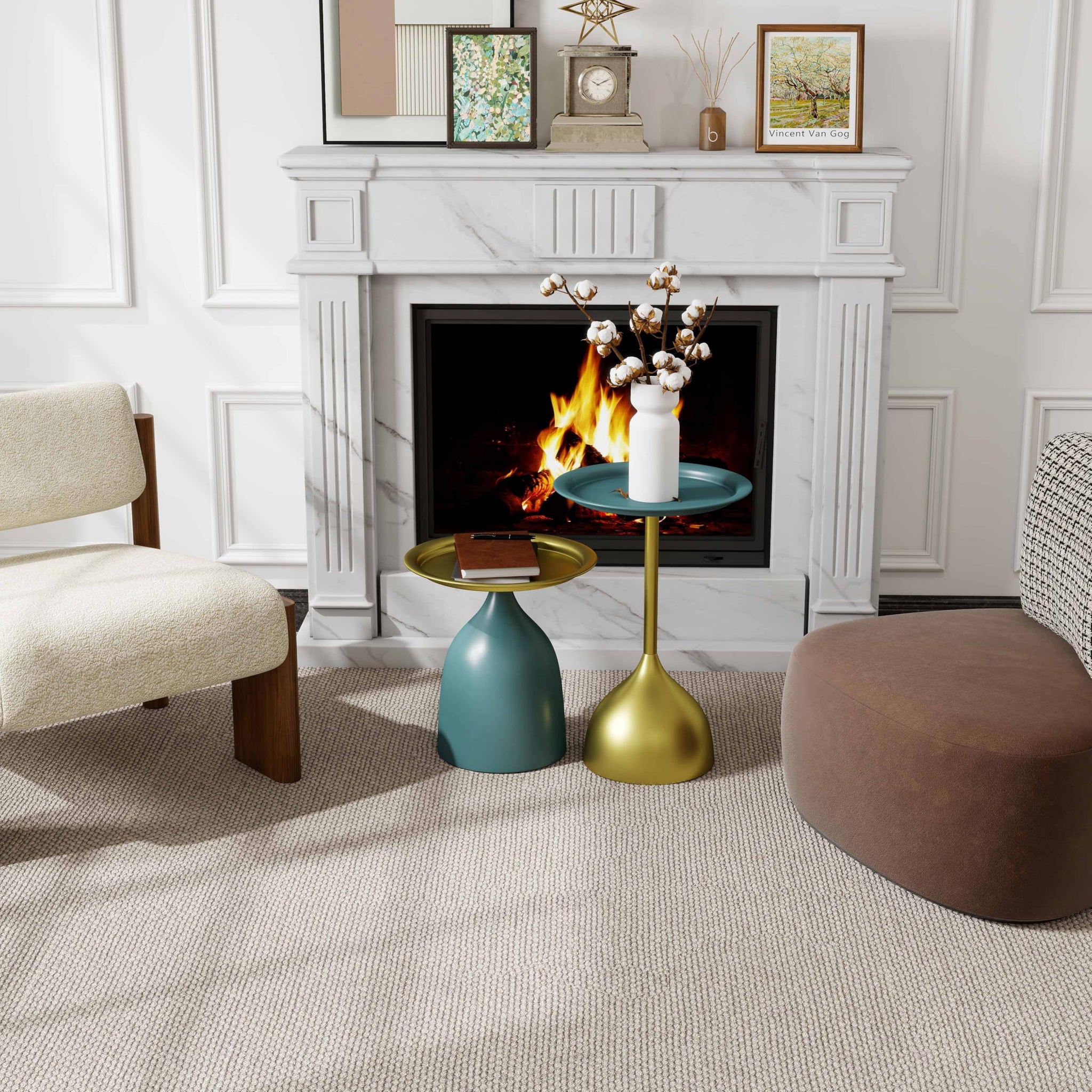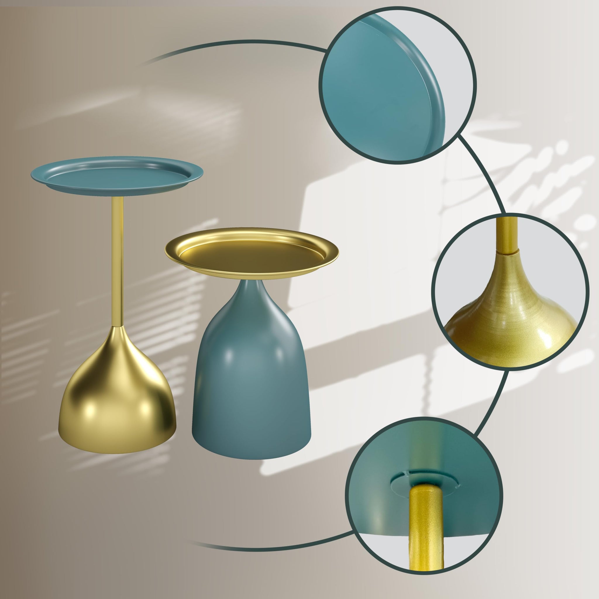 Ginhow Lot de 2 tables basses, bleues et dorées, rondes, design moderne, en métal, avec bord de table, diamètre : 40 x 60 cm, diamètre : 40 x 42 cm