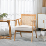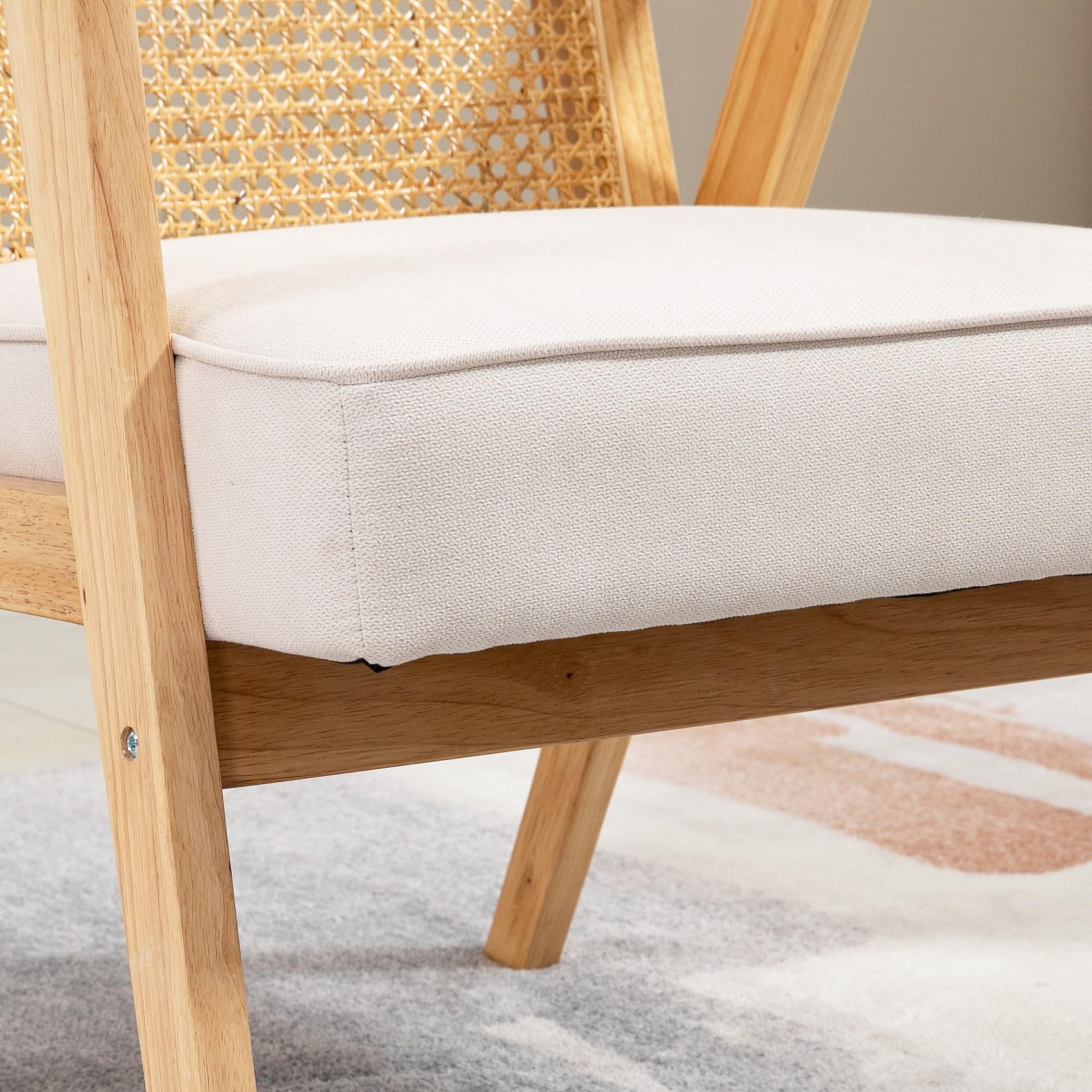 HOMCOM Fauteuil de Salon Confortable Chaise en Rotin avec Coussin épais- Dossier en cannage - Assise Profonde - Structure en Bois hévéa Aspect Lin Beige