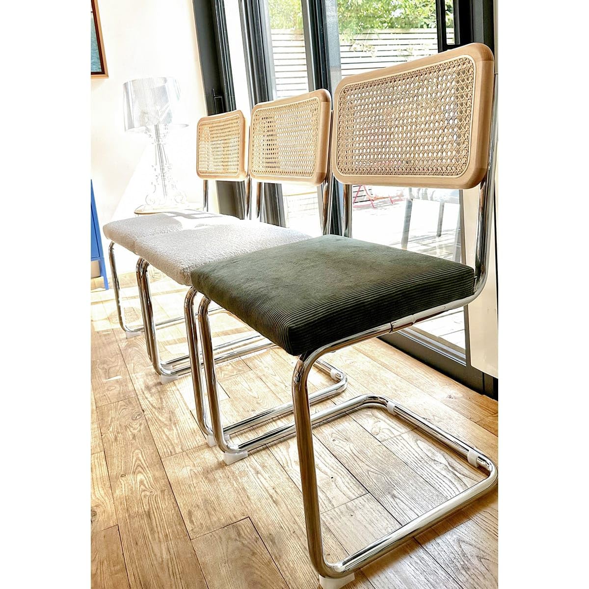 Le piètement luge en métal chromé, avec sa ligne continue et élégante, assure une assise stable tout en reflétant la lumière. Ce contraste subtil entre la texture du velours, la transparence du cannage et l'éclat du chrome crée une pièce à la fois chaleureuse et contemporaine.