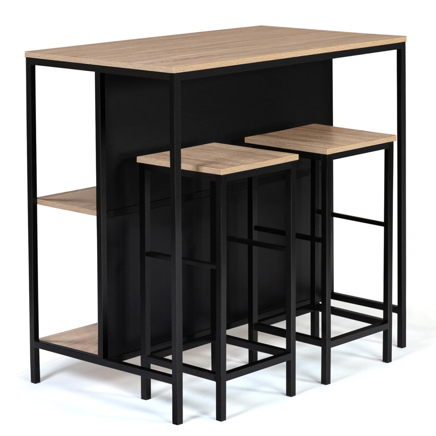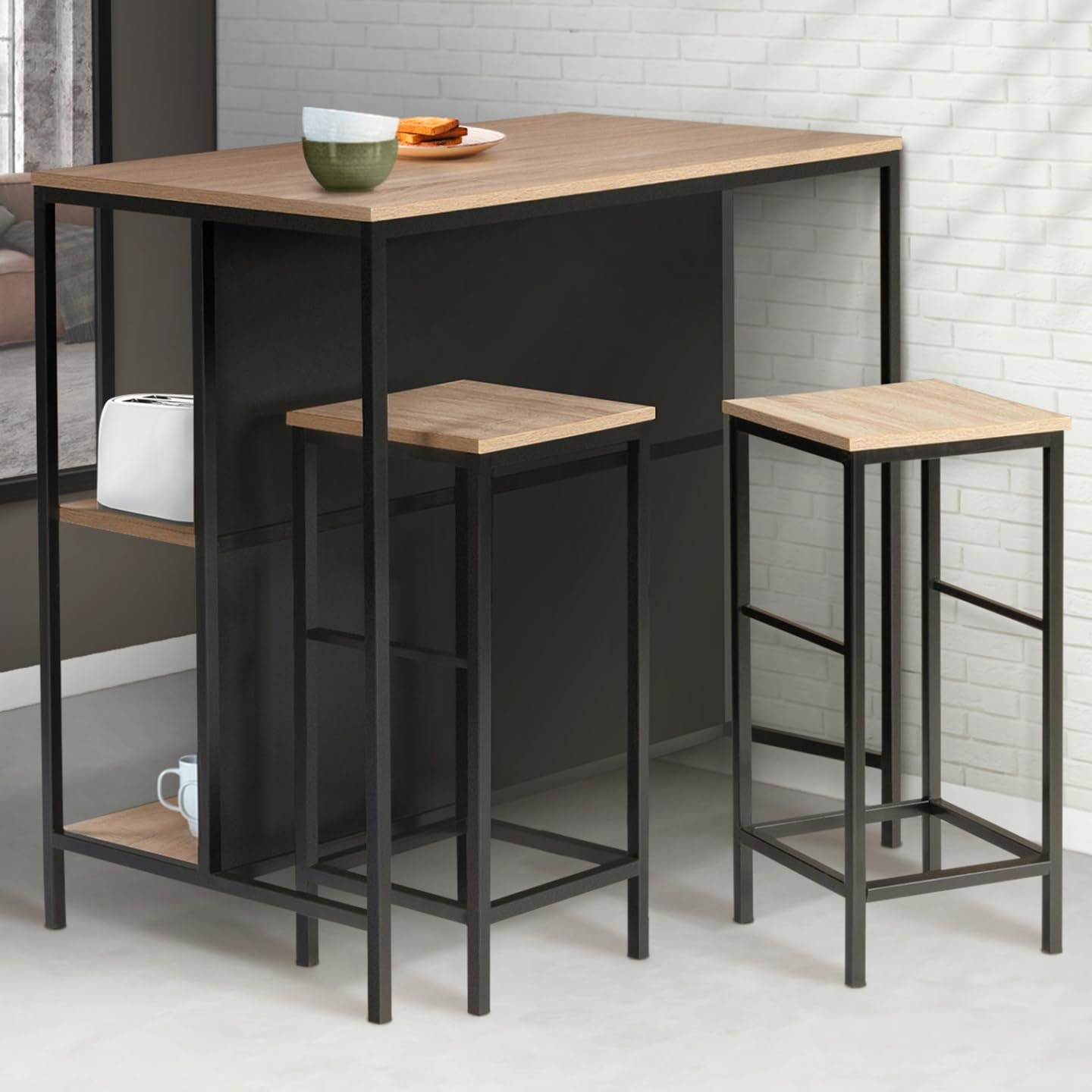 Si vous cherchez à aménager votre espace cuisine de manière optimisée, la table de bar DETROIT et ses 2 tabourets sont faits pour vous !Avec son design industriel bi-matière bois et métal, ses coloris naturels et ses lignes sobres et épurées, le mange-debout DETROIT se mariera avec tous les types d'intérieurs !Multifonction, ce meuble vous servira à la fois de plan de travail, de rangement et de table haute pour manger sur le pouce ou prendre un verre entre amis dans une ambiance décontractée !Son format compact est idéal pour aménager les petits espaces comme les studios ou venir délimiter l'espace de votre cuisine ouverte ! Les deux tabourets de bar se glissent sous le plateau pour un gain de place maximal !Hyper pratiques, ses 2 étagères vous permettront de ranger élégamment vaisselle, petit électroménager ou encore nourriture, optimisant ainsi votre rangement !Sa structure en panneaux de particules de bois (PB épaisseur 1,5 cm) et métal noir (2x2 cm) lui garantit solidité et stabilité.Un meuble compact et ultra fonctionnel spécialement conçu pour les petits espaces !Dimensions de la table de bar avec étagères et 2 tabouretsDimensions îlot : Longueur 100 cm x largeur 60 cm x Hauteur 95 cmDimensions étagères : Longueur 100 cm x largeur 30 cmHauteur entre chaque étagère : 40 cmDimensions des tabourets: Longueur 32 cm x largeur 32 cm x Hauteur 67 cmHauteur des pieds : 10 cmA monter soi mêmeRetrouvez nos meubles et éléments de cuisine ainsi que l'ensemble de notre collection industrielle sur notre boutique en ligne !