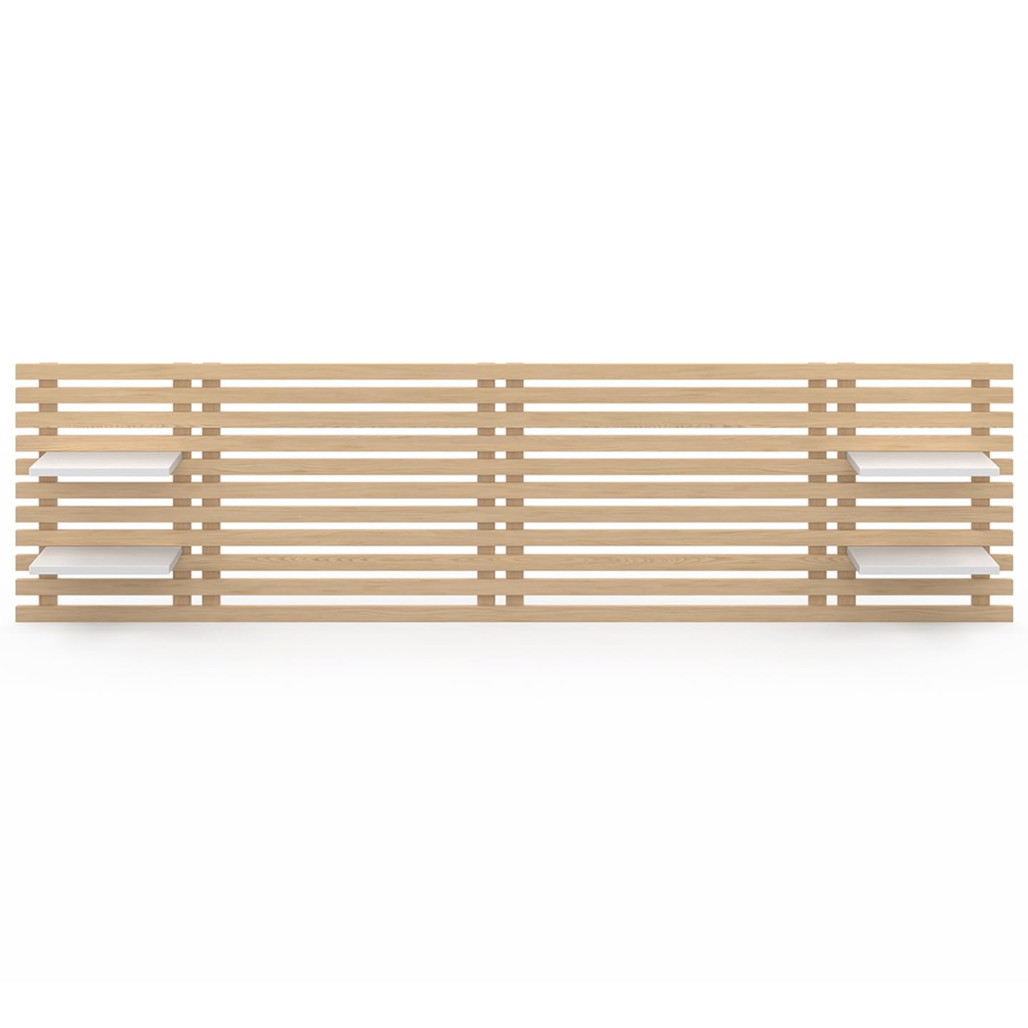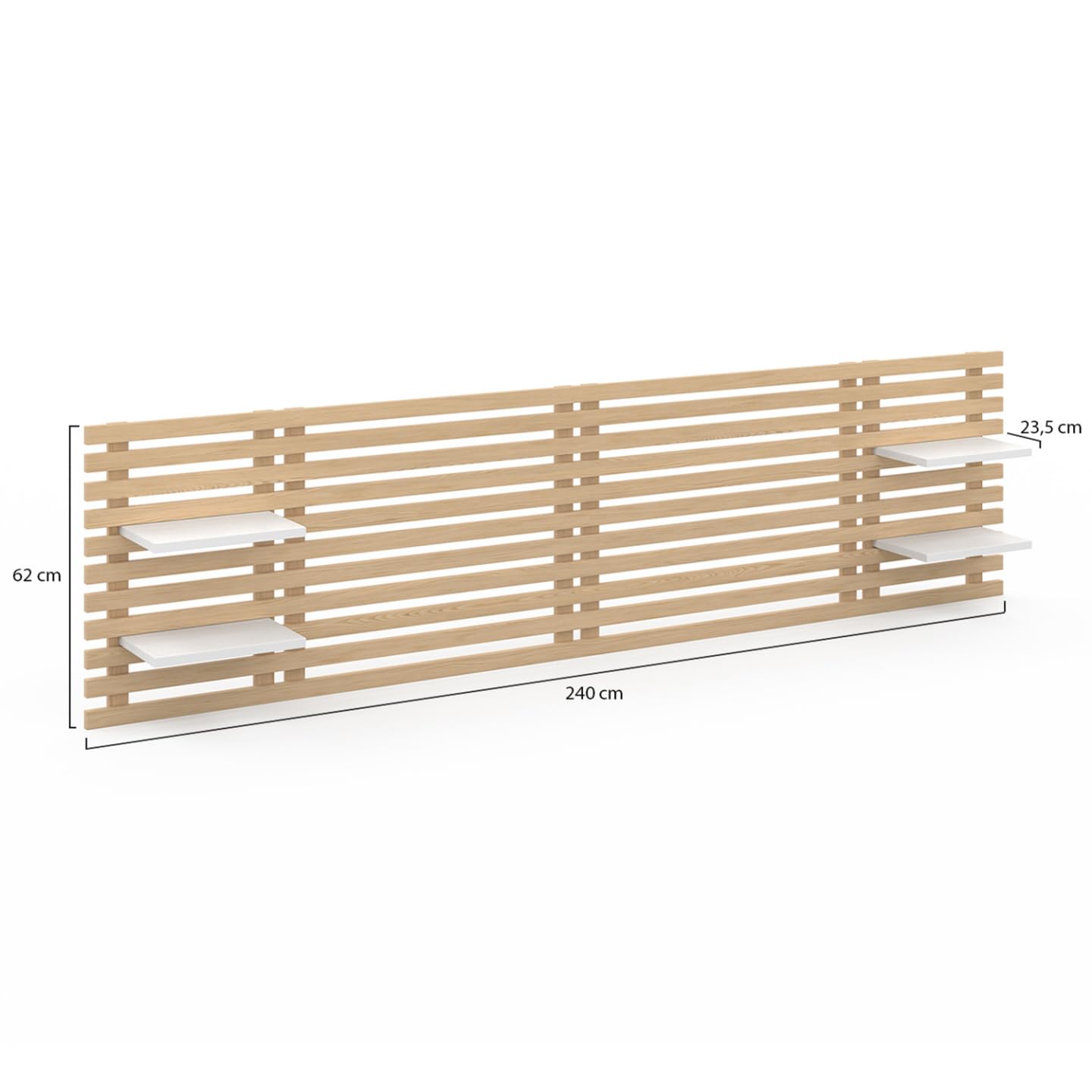 IDMarket - Tête de lit Suspendue en Lattes AVA 240 cm Bois Clair et étagères Blanches