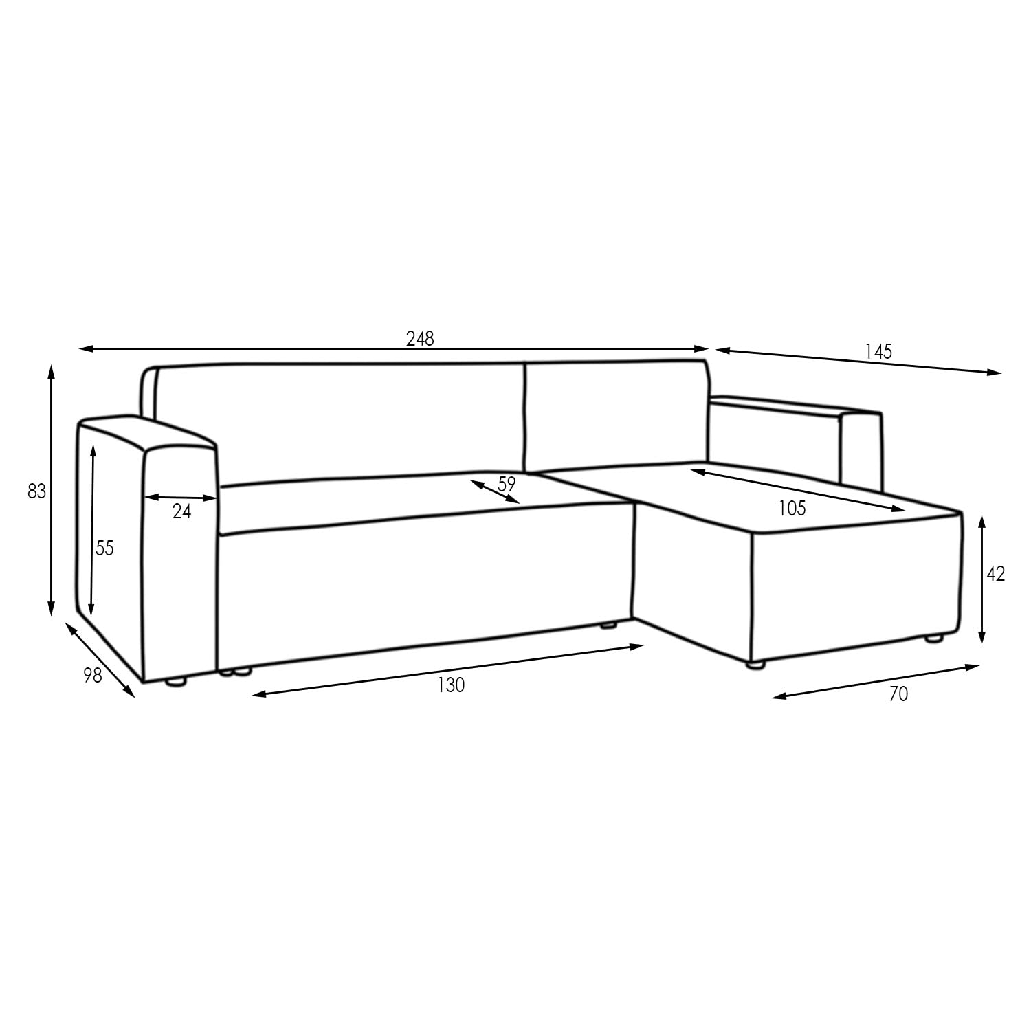 Le canapé d’angle Lorenzo est un canapé moderne aux lignes épurées et aux dimensions généreuses. Ce canapé d’angle réversible dispose d’une assise principale et d’une large méridienne en velours côtelé. Le revêtement agréable au toucher de ce canapé apportera de la douceur à votre intérieur. Lorsque vous allez avancer l’assise principale vers vous, vous allez découvrir un coffre de rangement où vous pourrez y glisser coussins et couvertures : c’est notre secret pour un intérieur rangé et organisé. Activez en quelques minutes le mécanisme astucieux de ce canapé pour mettre place un lit d’appoint. Il vous suffit d’avancer l’assise principale vers vous puis de rabattre le dossier grâce aux charnières : un vrai jeu d’enfant ! Le plus de ce canapé ? Sa fonction réversible. Plus besoin de choisir à l’achat si vous voulez un canapé d’angle droit ou un canapé d’angle gauche car il fait les deux. Que vous déménagiez ou que vous décidiez de changer l’agencement de votre salon, il pourra toujours trouver sa place dans votre intérieur. N’attendez plus pour vous faire plaisir en remplaçant votre ancien canapé par le canapé Lorenzo au revêtement noble et élégant. Vous n’allez plus envier le mobilier de votre entourage car vous aurez la pièce tendance que tout le monde désire. - Largeur du canapé: 248cm - Profondeur du canapé: 145cm - Hauteur 83cm - Profondeur d'assise: 59cm - Profondeur d'assise méridienne: 105cm - Hauteur d'assise : 42cm - Densité assise: 28kg/m3 - Densité du dossier: 28kg/m3 - Hauteur des accoudoirs: 55cm - Largeur des accoudoirs: 24cm - Dimension coffre de rangement: 56x57x13cm - Dimension du couchage: L211xL123xH13cm