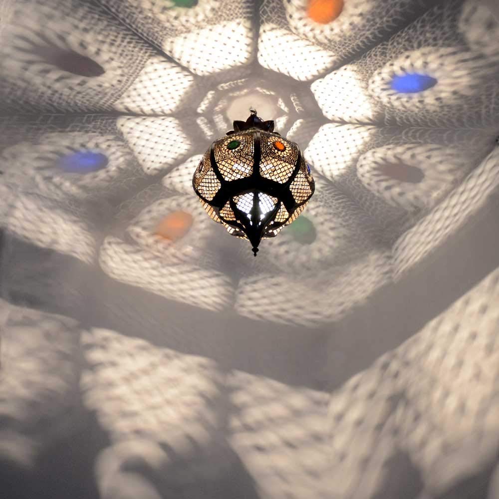 - Matériau : avec cette lampe spéciale Cleopatra en métal et pierres de résine coulée colorées, enchantez vos pièces dans un lieu de 1001 nuits. Les pierres colorées en résine coulée diffusent la lumière dans les plus belles couleurs sur les murs. La monture en métal a été recouverte d'une belle patine de cuivre et galvanisée afin de garantir une longue durée de vie.