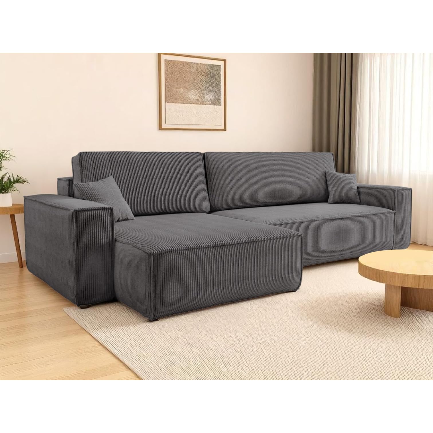 Détails: Offrez à votre intérieur un canapé d’angle réversible et convertible qui combine design moderne, confort et praticité. Le canapé FARAH est pensé pour les salons qui recherchent un grand canapé d’angle 5 places à la fois élégant et fonctionnel. Sa méridienne spacieuse et son angle réversible vous permettent de l’adapter facilement à votre pièce, que vous choisissiez une installation à gauche ou à droite. Grâce à sa fonction convertible, ce canapé d’angle transformable se déploie en un lit d’appoint confortable, parfait pour recevoir famille et amis. Pratique et ingénieux, le coffre de rangement intégré sous l’assise offre un espace supplémentaire pour ranger oreillers, plaids ou linge de lit. Vous gagnez ainsi en confort tout en conservant un espace de vie ordonné. Disponible en tissu bouclette doux et texturé ou en velours côtelé chic et structuré, le canapé FARAH se distingue par ses finitions passepoilées élégantes qui renforcent son esthétique contemporaine. Sa structure solide en bois de pin et panneaux agglomérés lui confère robustesse et durabilité, tandis que deux coussins assortis apportent la touche finale de confort. 👉 Avec le canapé d’angle convertible FARAH, profitez d’un meuble polyvalent qui associe confort, design et praticité au quotidien. Idéal pour aménager un salon moderne et convivial.