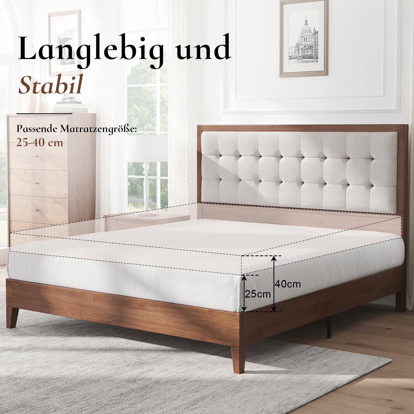 LUXOAK Lit en Bois de pin Massif 160 x 200 cm avec tête de lit rembourrée, lit en Bois pour Chambre à Coucher ou Chambre d'amis, Housse en Lin, Aspect Noyer