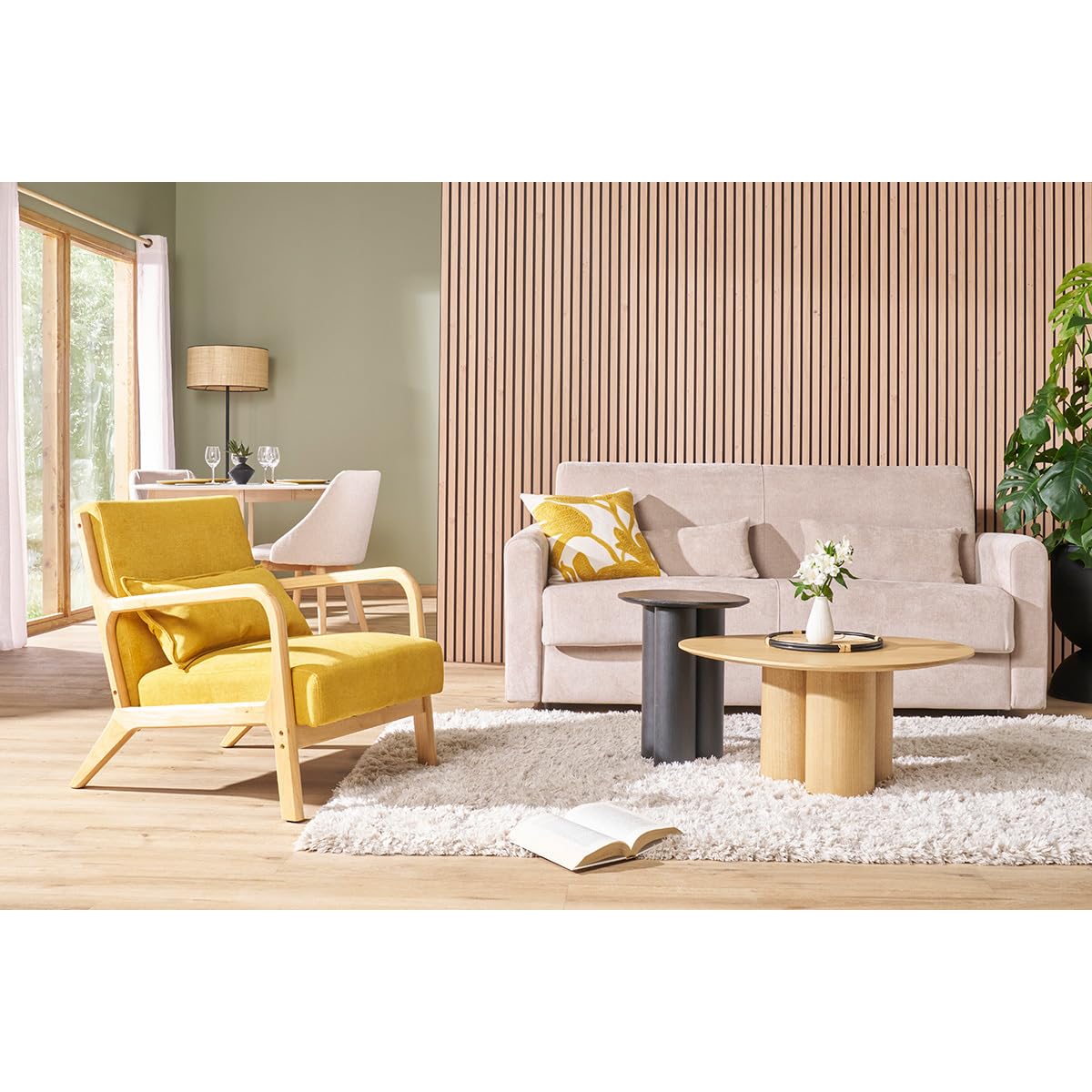 Avec ses dimensions peu encombrantes (L44.5 x P35.5 x H48.5 cm), cette table d'appoint originale complétera avec charme la décoration de vos pièces de vie, même les plus exiguës ! Le plateau ovale tout en courbes (L45.5 x L35.5 x E1.9) repose sur un piètement central, formé par trois bases cylindriques. Un ensemble en panneaux de fibres de bois placage chêne teinté qui fait ainsi rimer robustesse et facilité d'entretien.
