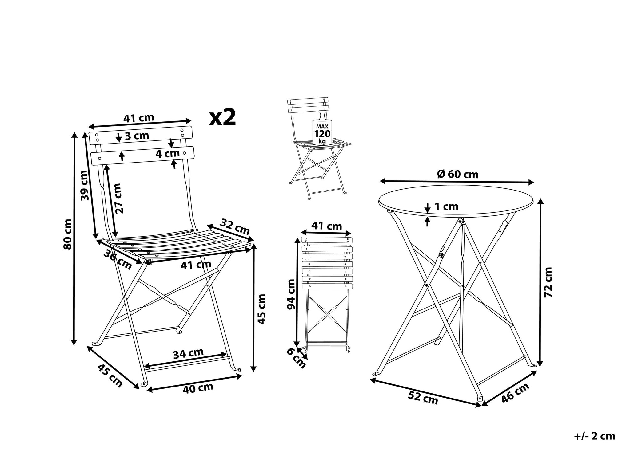 - Dimension: Table: 60 x 72 cm (Ø x H) et 2 Chaises : 45 x 40 x 80 cm (L x l x H)