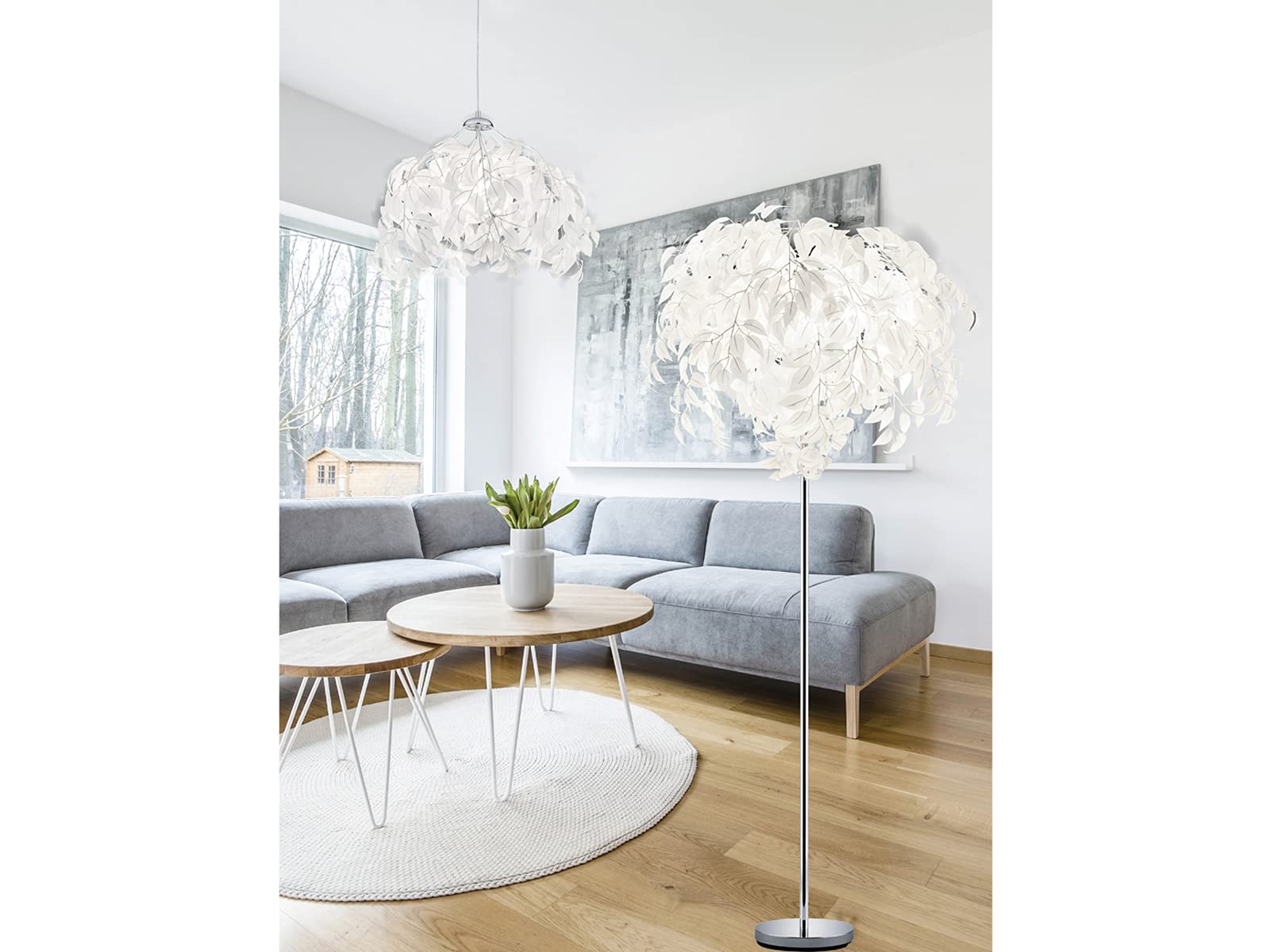 Détails: La suspension LED originale se distingue par sa variété de feuilles en plastique. Cela fait de la lampe un point fort sur votre plafond. Un objet d'éclairage magique pour les espaces de vie dont le style peut être associé à la vie des jeunes. Les feuilles en plastique blanc et le baldaquin chromé peuvent être combinés avec d'autres concepts de couleurs différents et facilitent ainsi l'intégration dans votre maison. Que ce soit au-dessus de la table à manger ou de la table basse dans le salon : la suspension a un diamètre de 38 cm, attire tous les regards et un objet de décoration original. La lampe est équipée d'une douille E27 et est livrée avec une ampoule LED interchangeable de 7 W et 806 lumens en blanc chaud (2700 K), qui peut être réglée sur 3 niveaux via un interrupteur d'éclairage traditionnel. L'intensité lumineuse diminue progressivement en appuyant plusieurs fois de suite. Matériau : plastique, métal Couleur : blanc - argent chrome brillant Dimensions : hauteur : 150 cm, diamètre : 38 cm Ampoule incluse : oui / LED - remplaçable (1 x E27 / 7 W) Intensité lumineuse : 1 x 806 lumens = 806 lumens Couleur de la lumière : blanc chaud (2700 K) Intensité variable : oui - Ampoule incluse à intensité variable par interrupteur Tension : 230 V Protection : IP22 0 - Classe de protection : 1 Poids : 0,603 kg