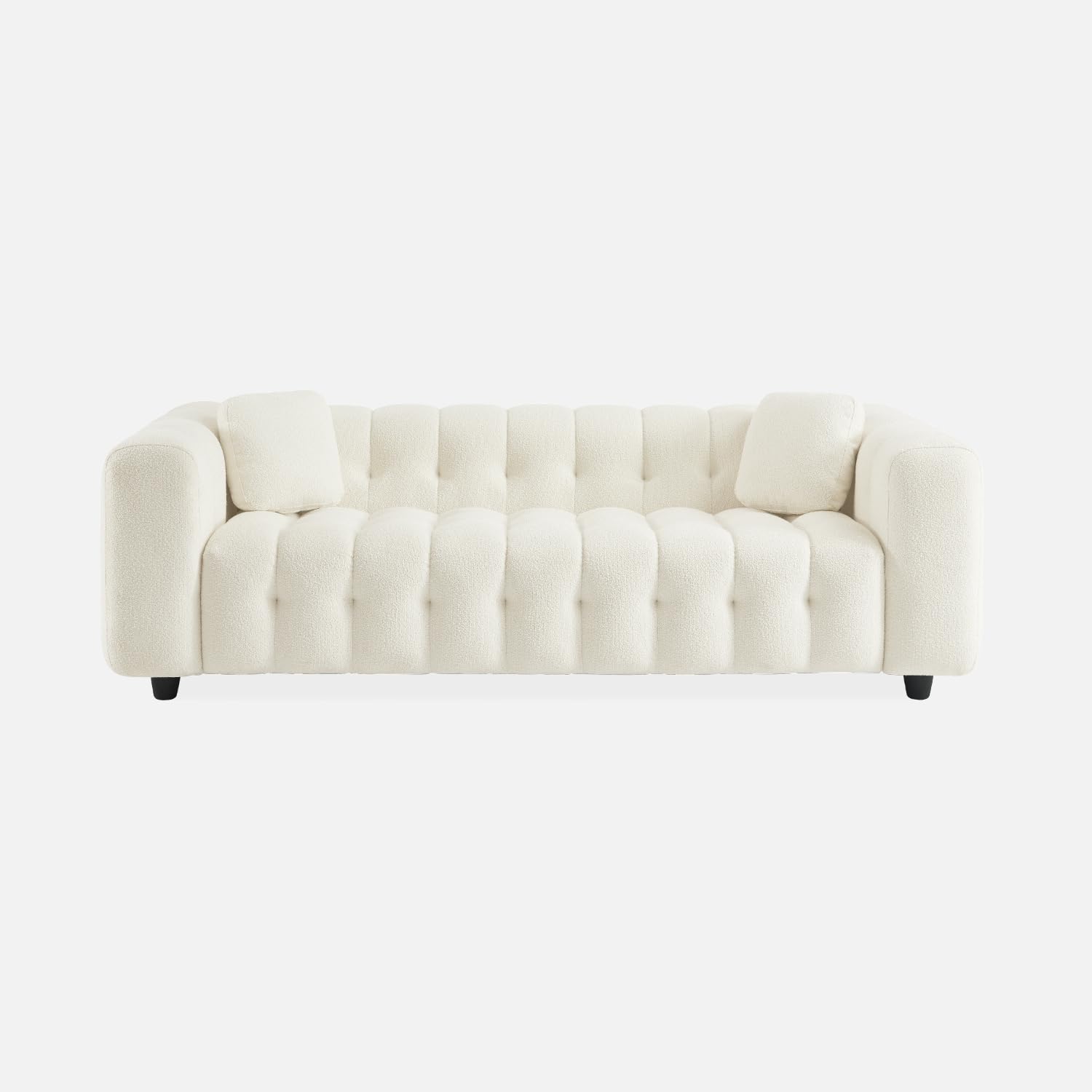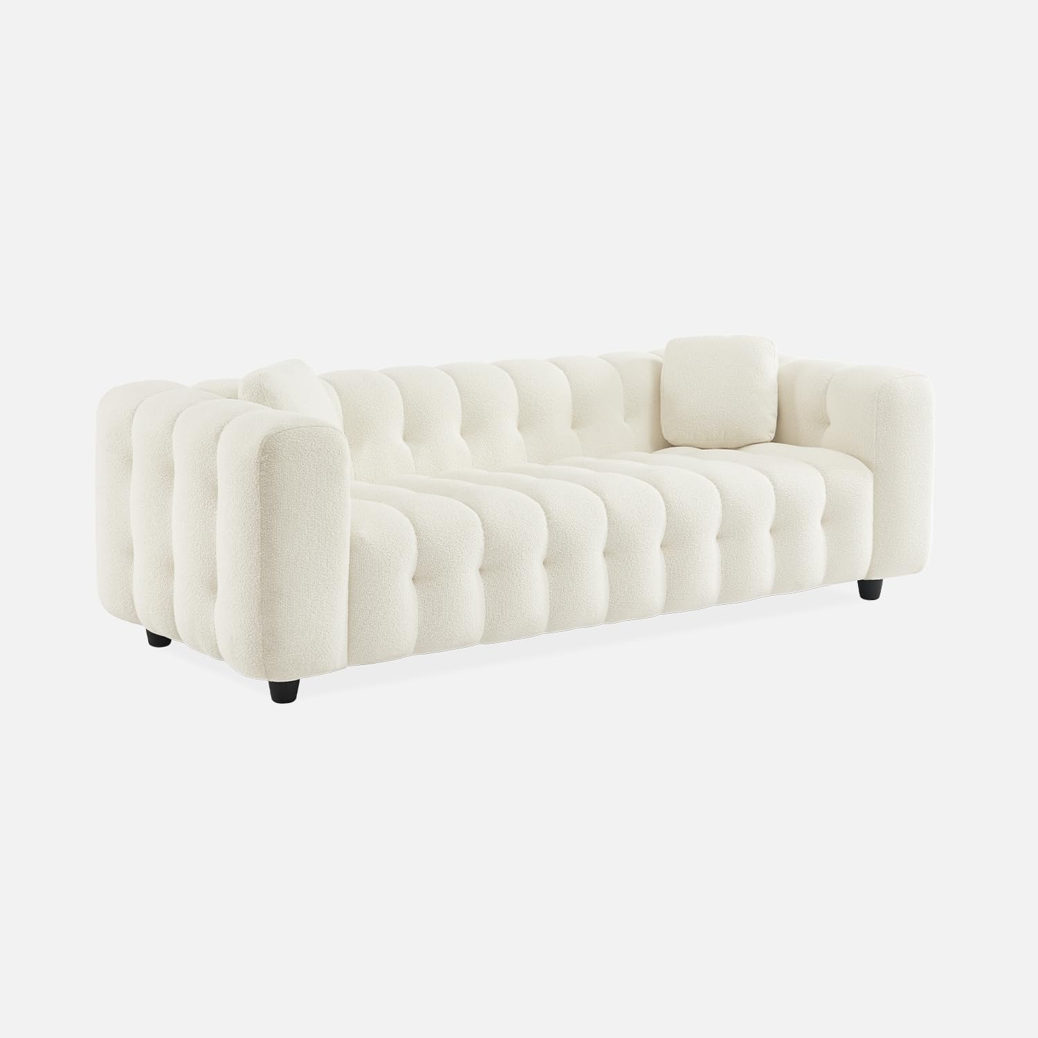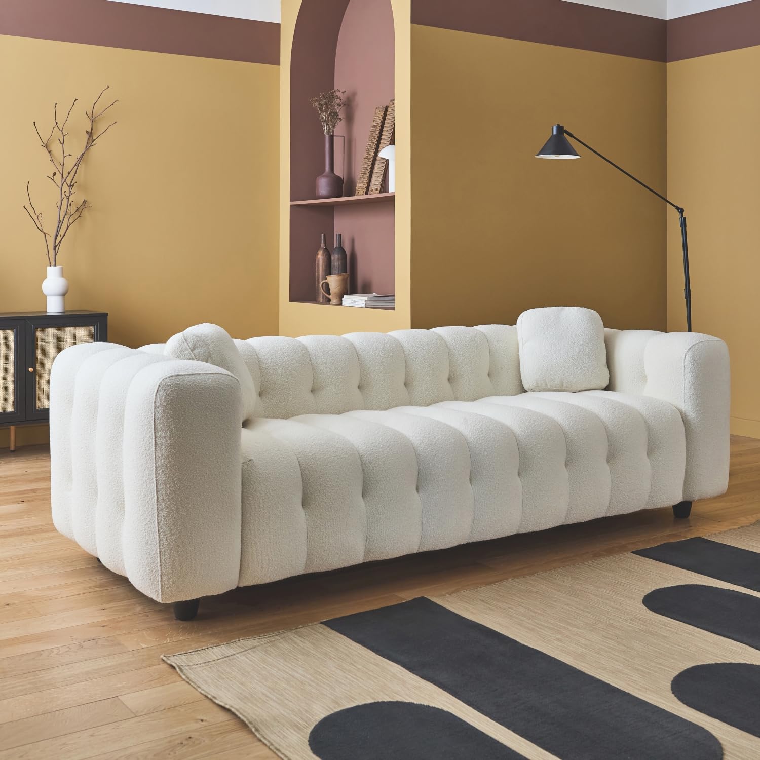 sweeek - Canapé 3 Places en Bouclette texturée capitonné Blanc crème - Structure Bois d'eucalyptus et contreplaqué