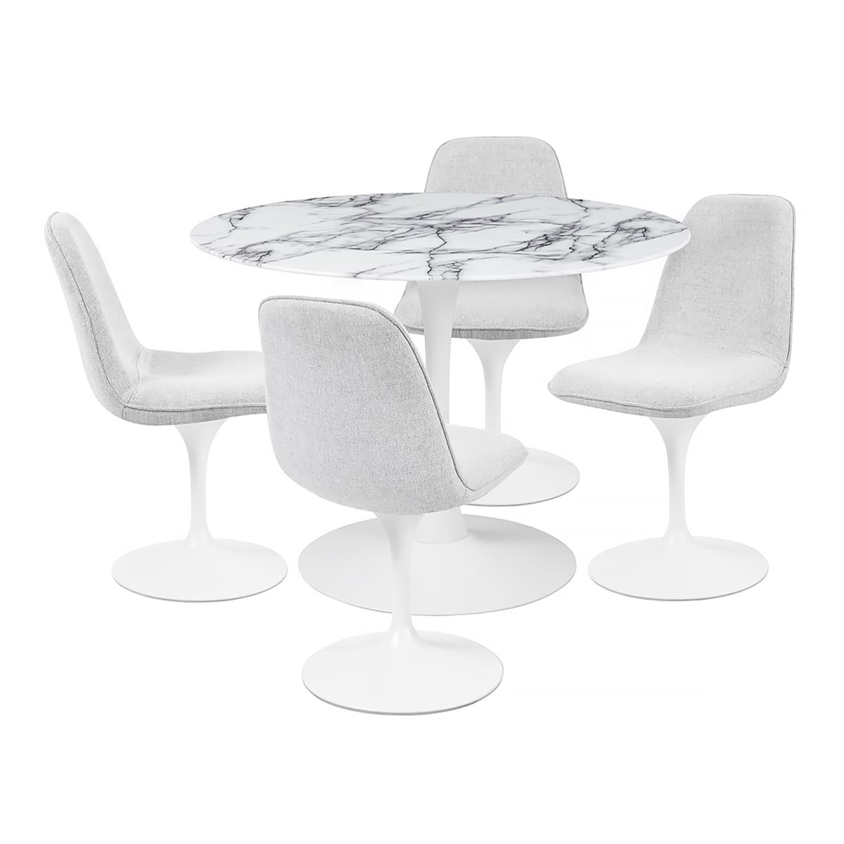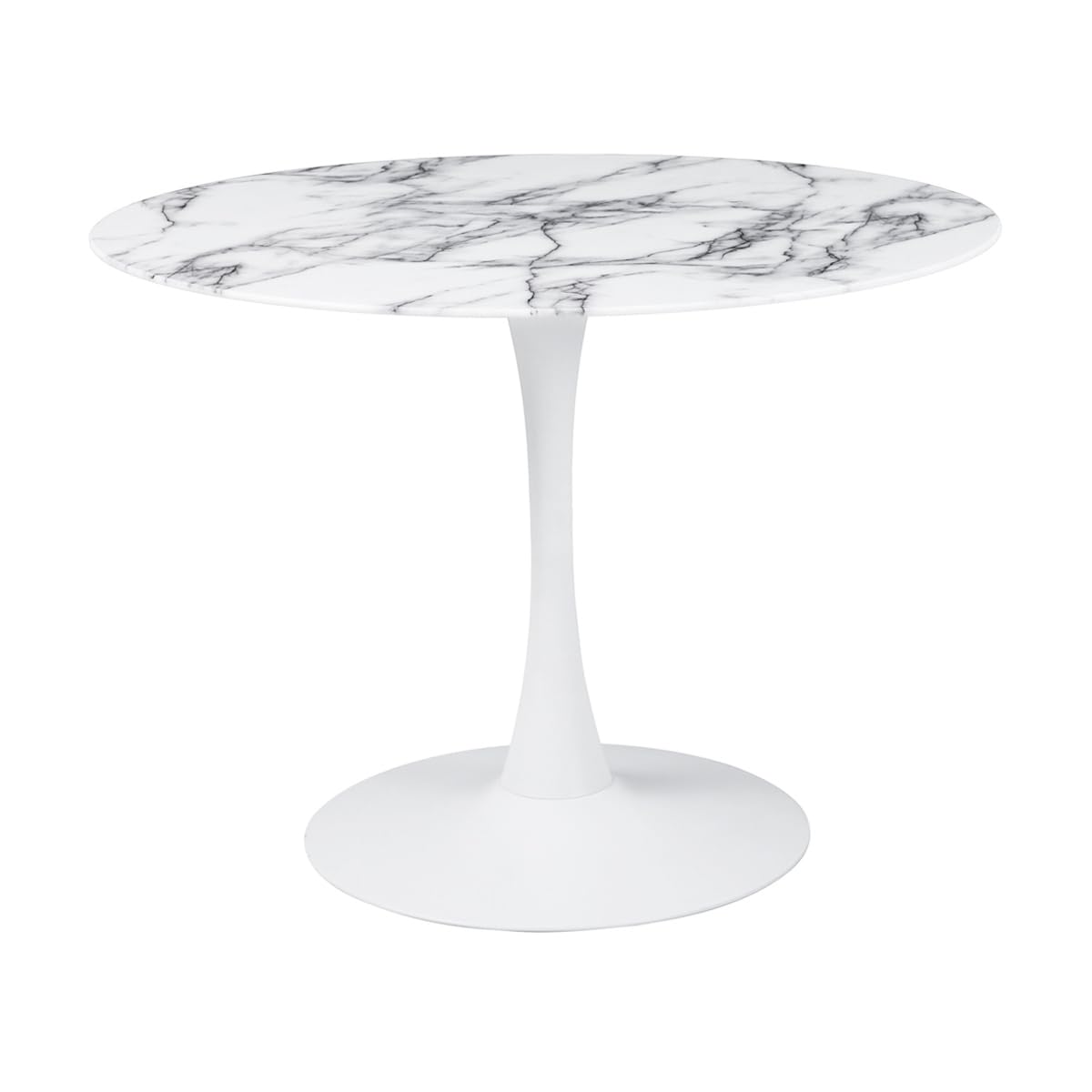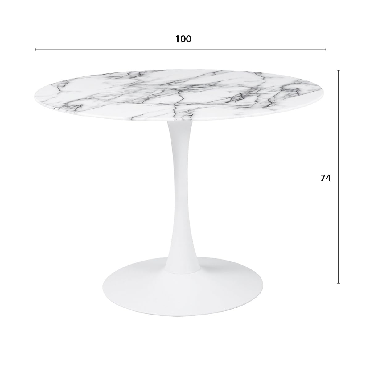 Table à Manger Ronde pour 4 à 5 Personnes diamètre 100 cm, Plateau en Verre trempé Aspect marbre Blanc, Base Ronde en métal Blanc - Tulips