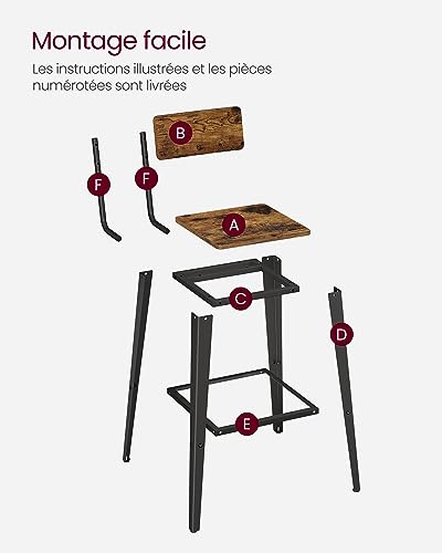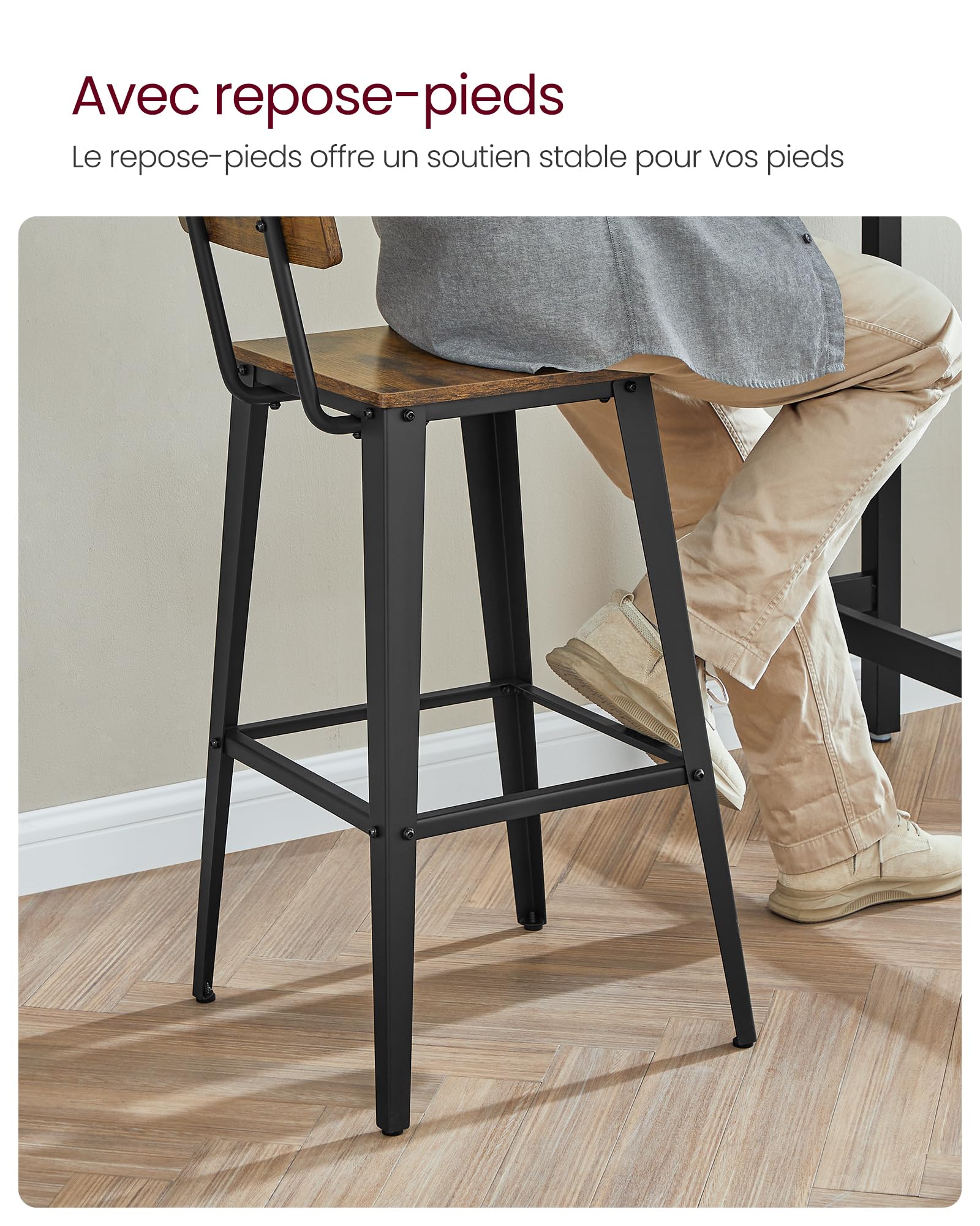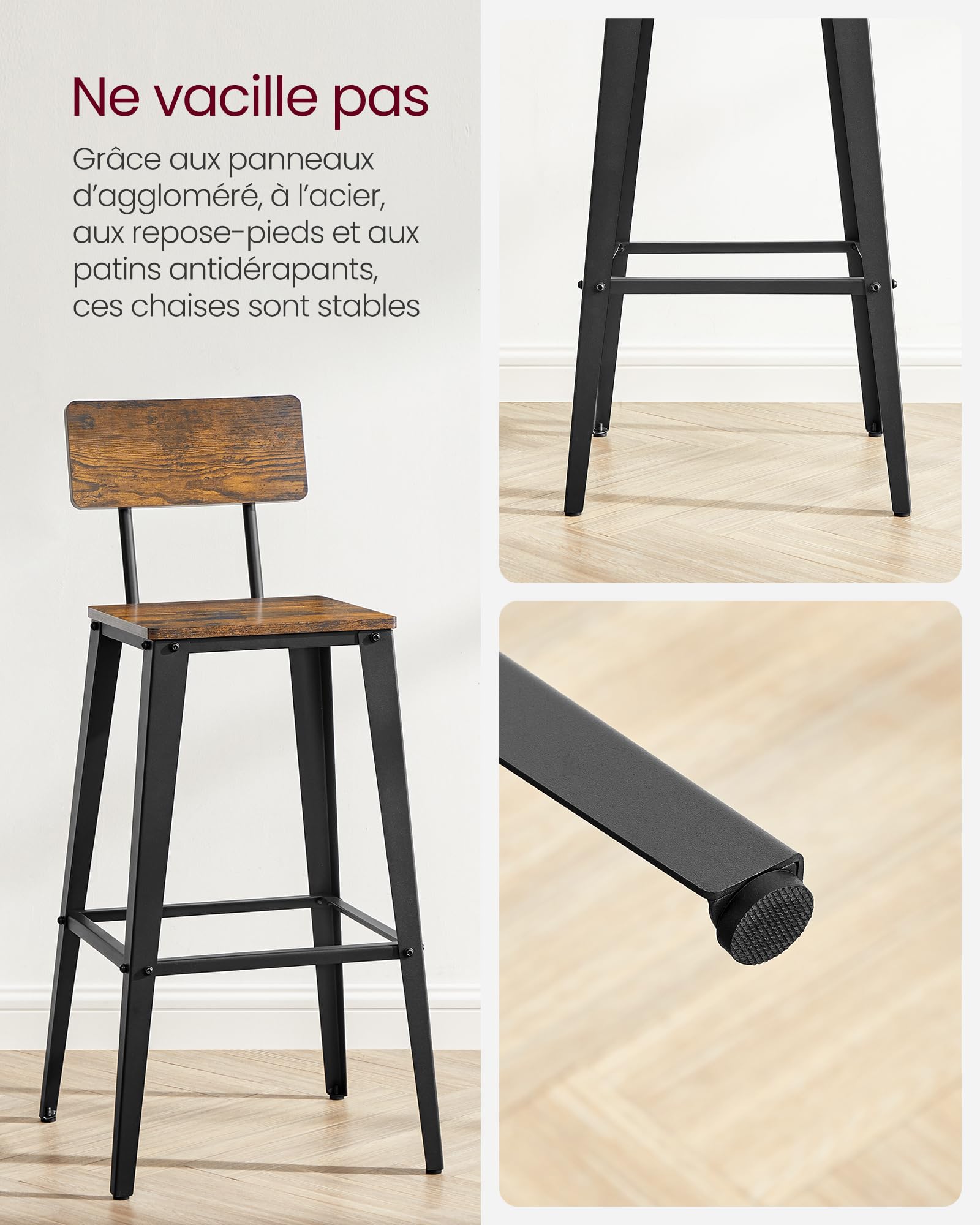 VASAGLE Tabouret Bar Industriel, Lot de 2, Chaise Bar Cuisine, avec Dossier, Cadre en Acier, Montage Facile, Style Industriel, Marron Rustique et Noir d'encre LBC078B01
