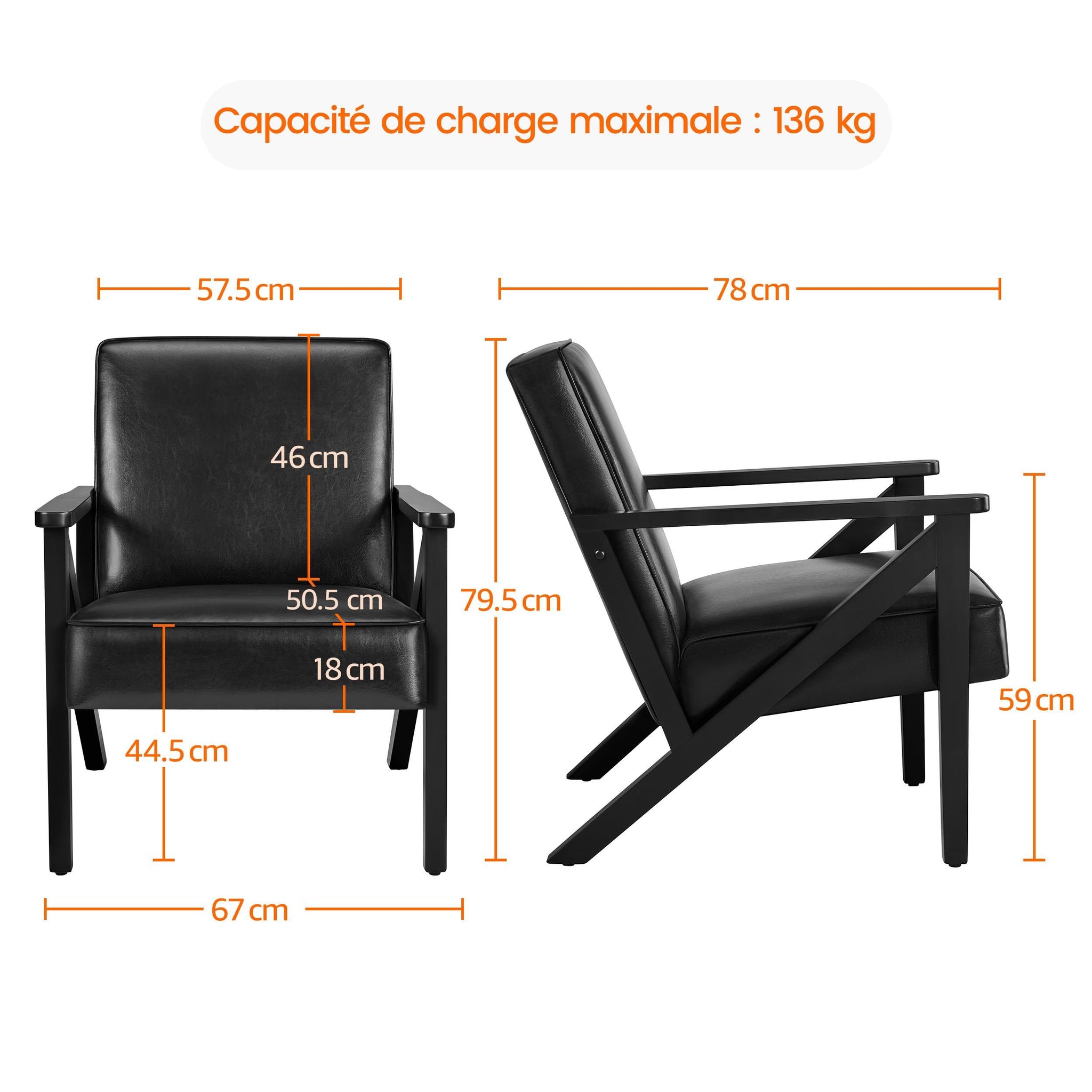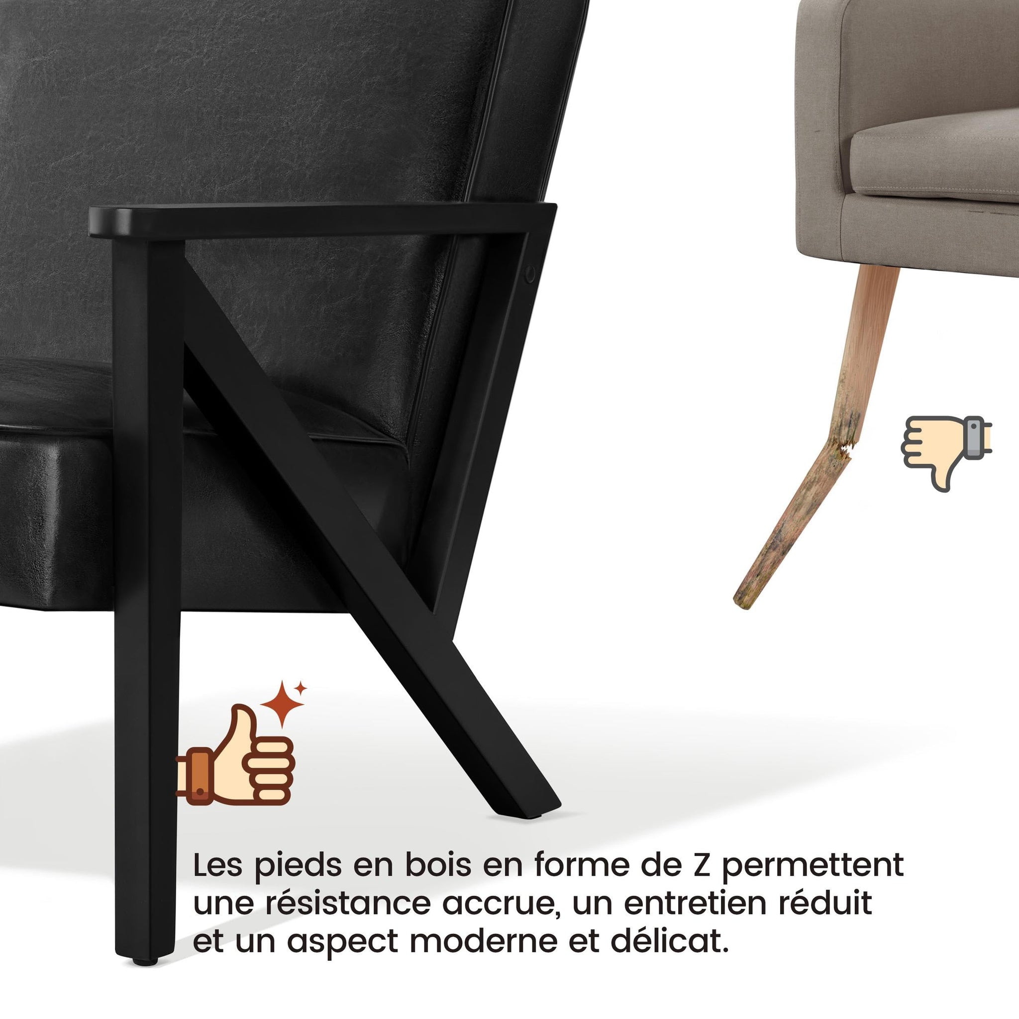 • Structure robuste : Ce lot de 2 fauteuils de salon est composé d’un cadre en bois massif d'hévéa, conçu en forme de « Z » pour plus de stabilité. Il a été testé par SGS et est conforme à la norme EN 12520:2024 Mobilier - Sécurité, résistance et durabilité - Exigences pour les sièges domestiques. Le fauteuil peut accueillir une personne pesant jusqu'à 136 kg